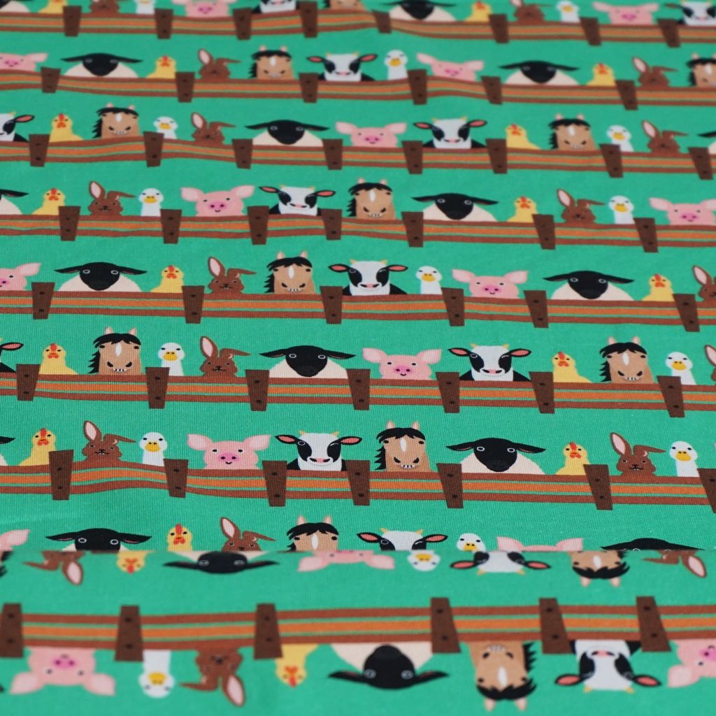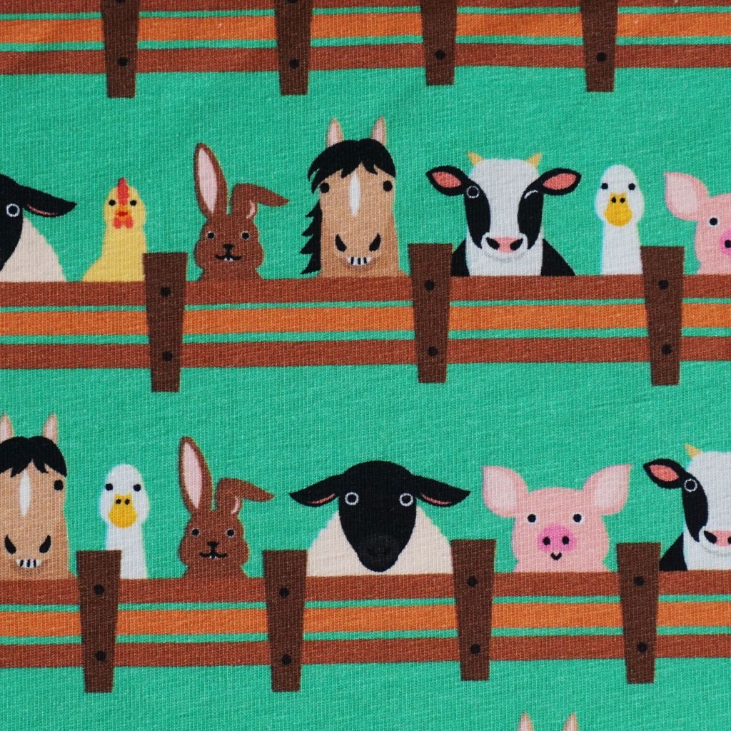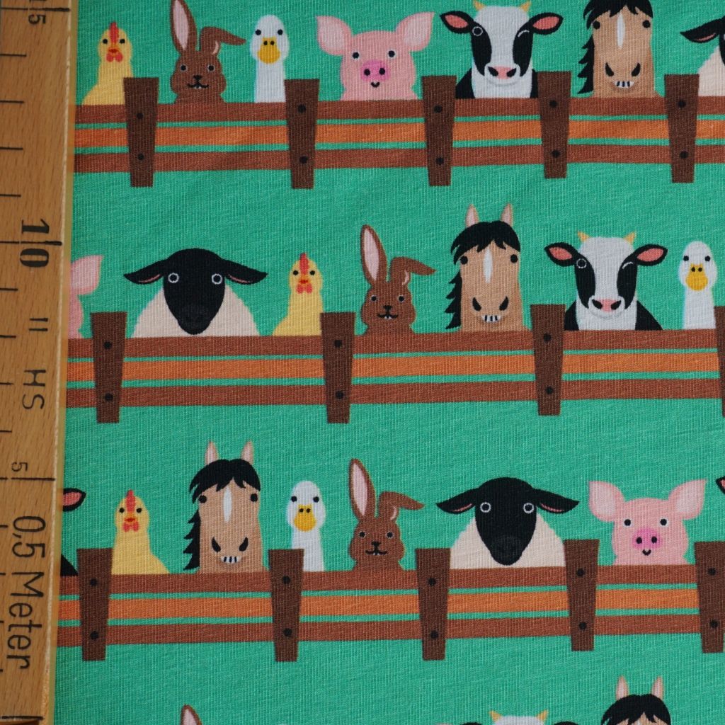 Baumwolljersey Bauernhoftiere am Zaun grün