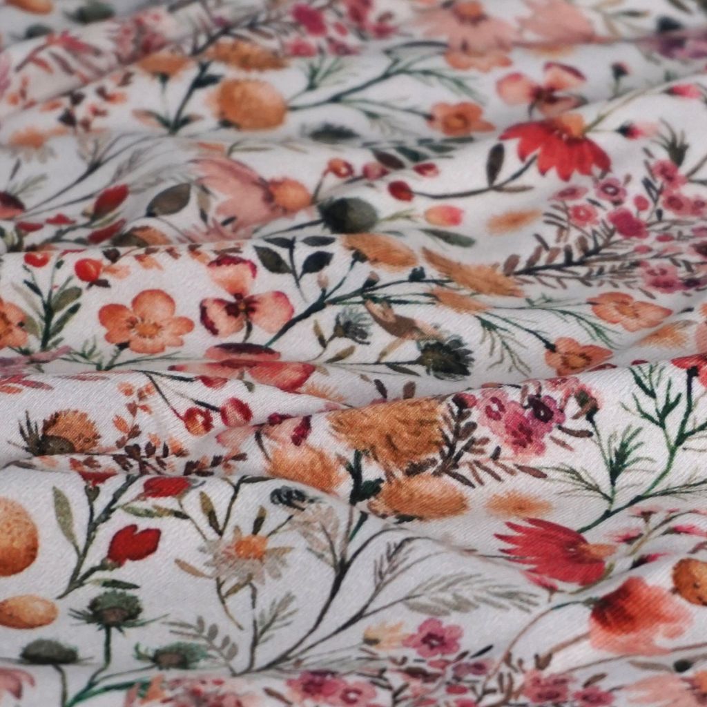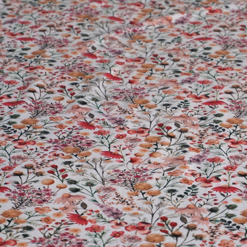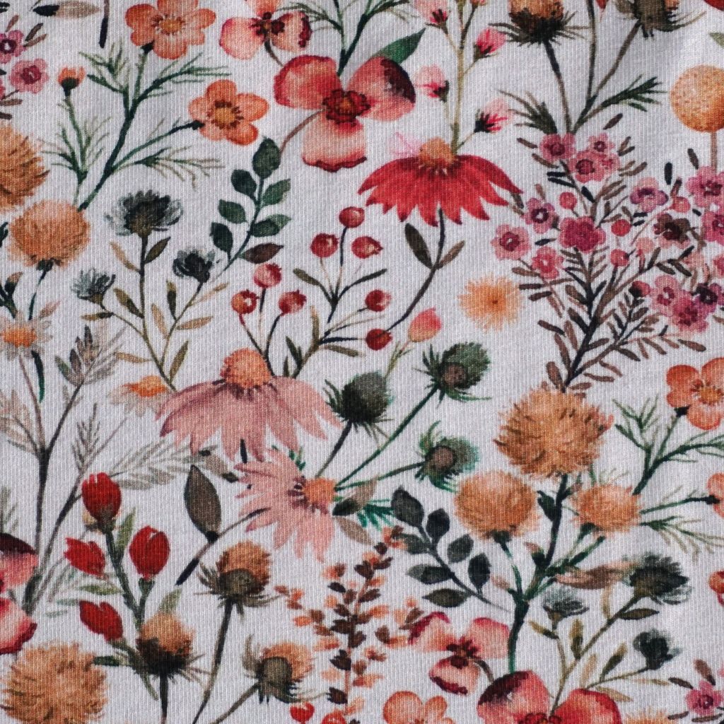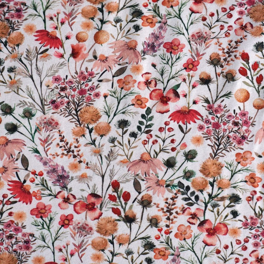 Baumwolljersey Blumenwiese Rottöne auf ecru