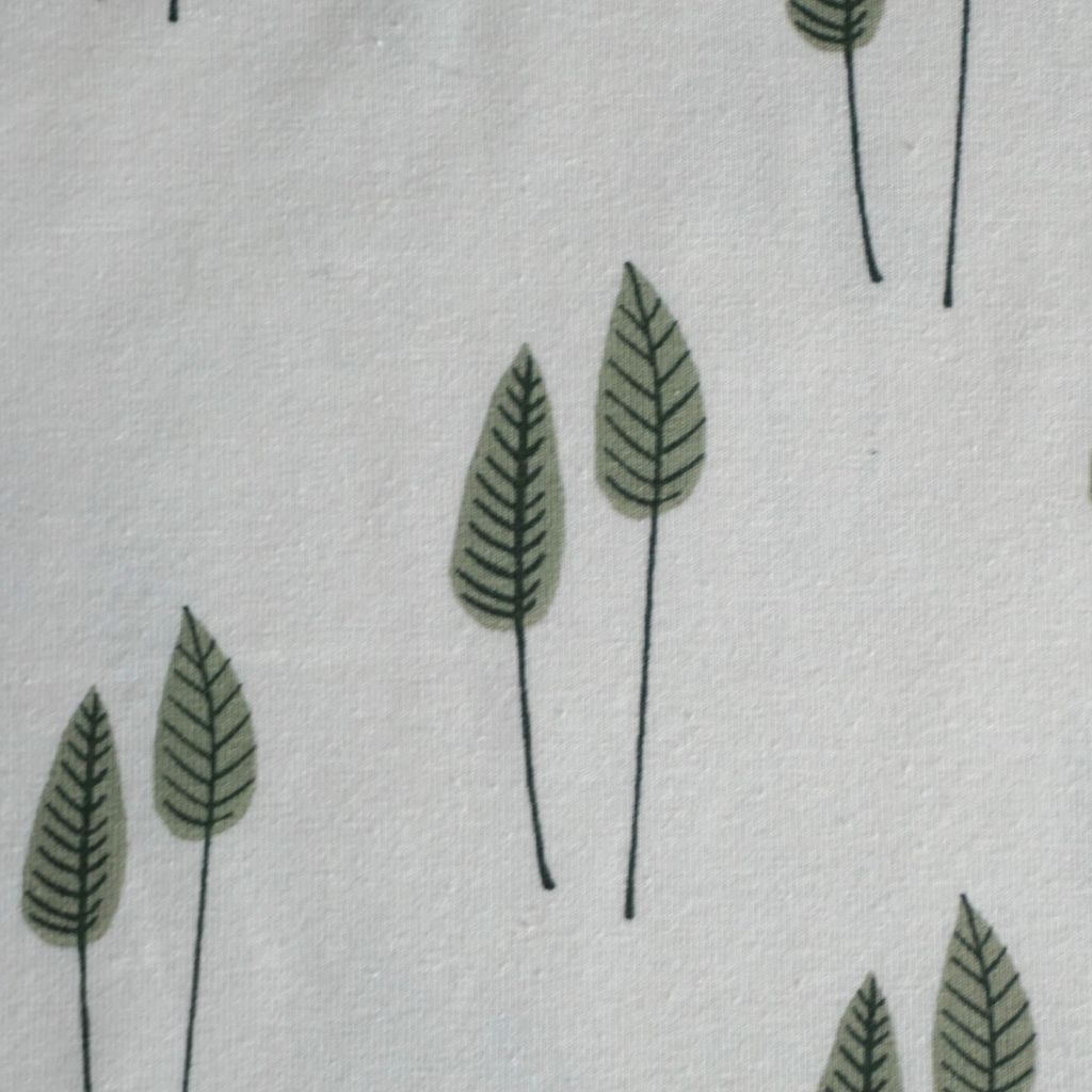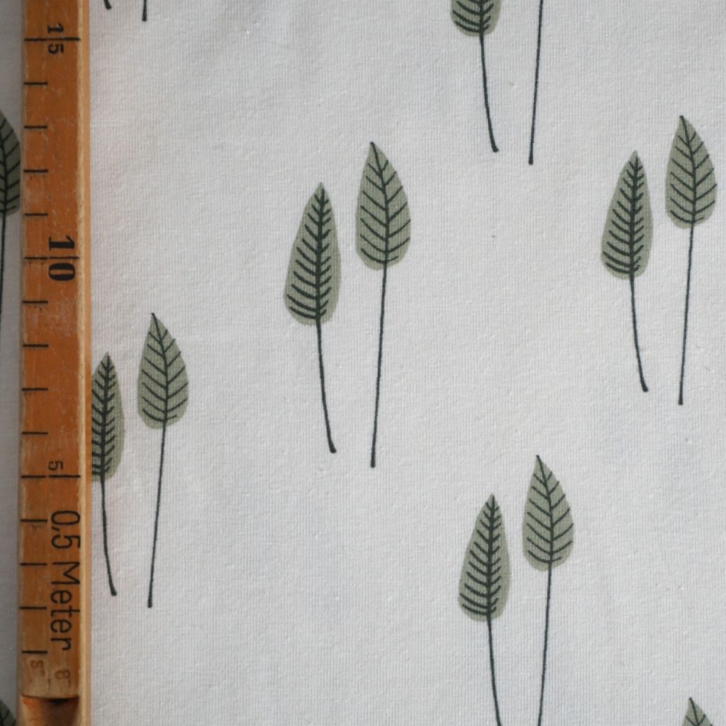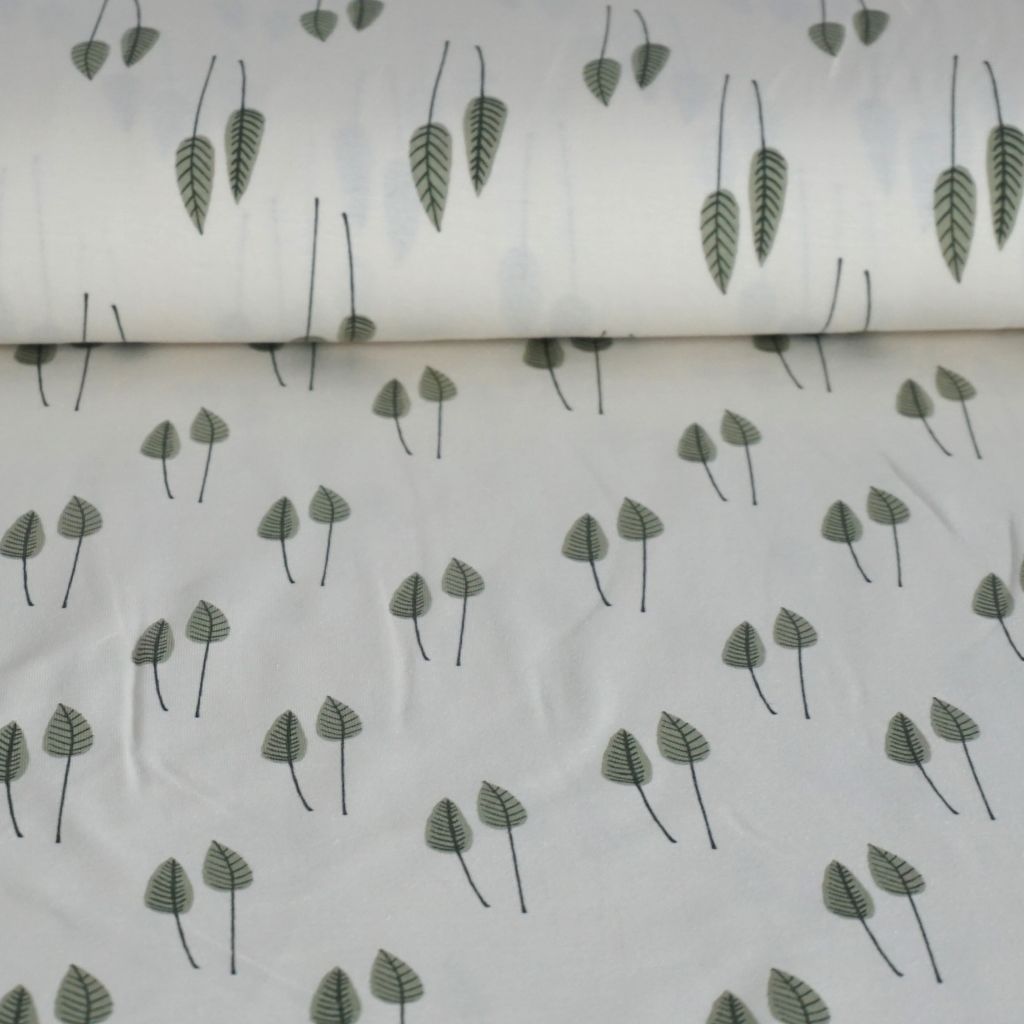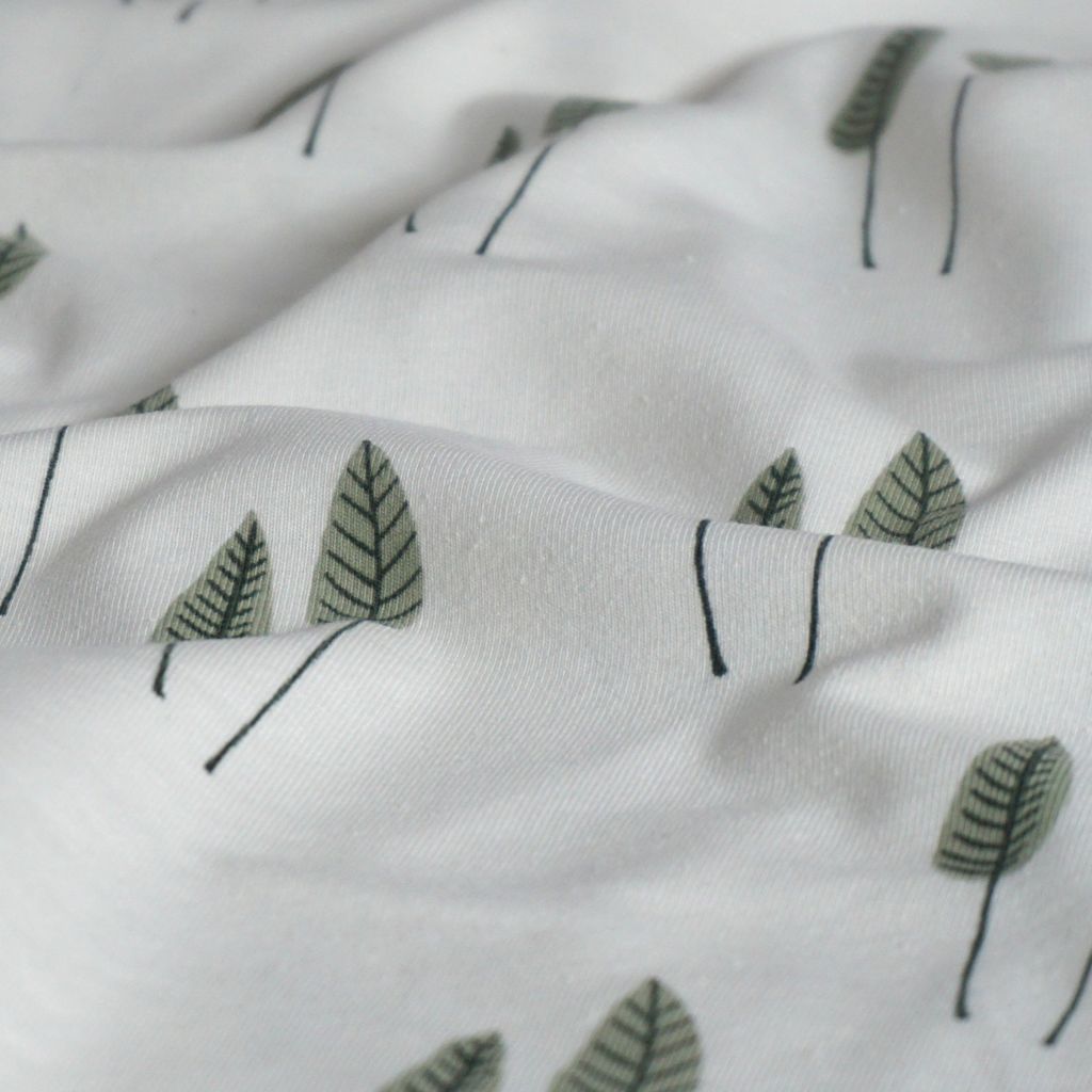Baumwolljersey grüne Blätter auf wollweiß