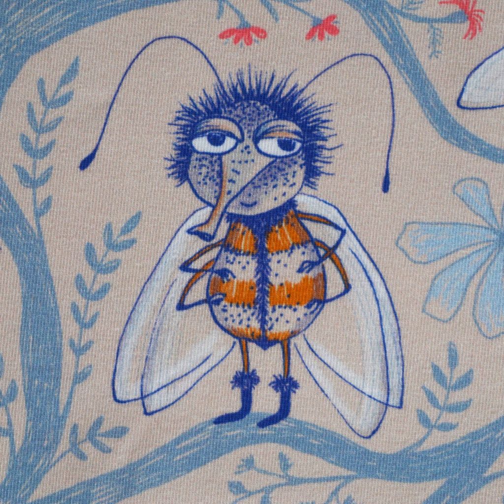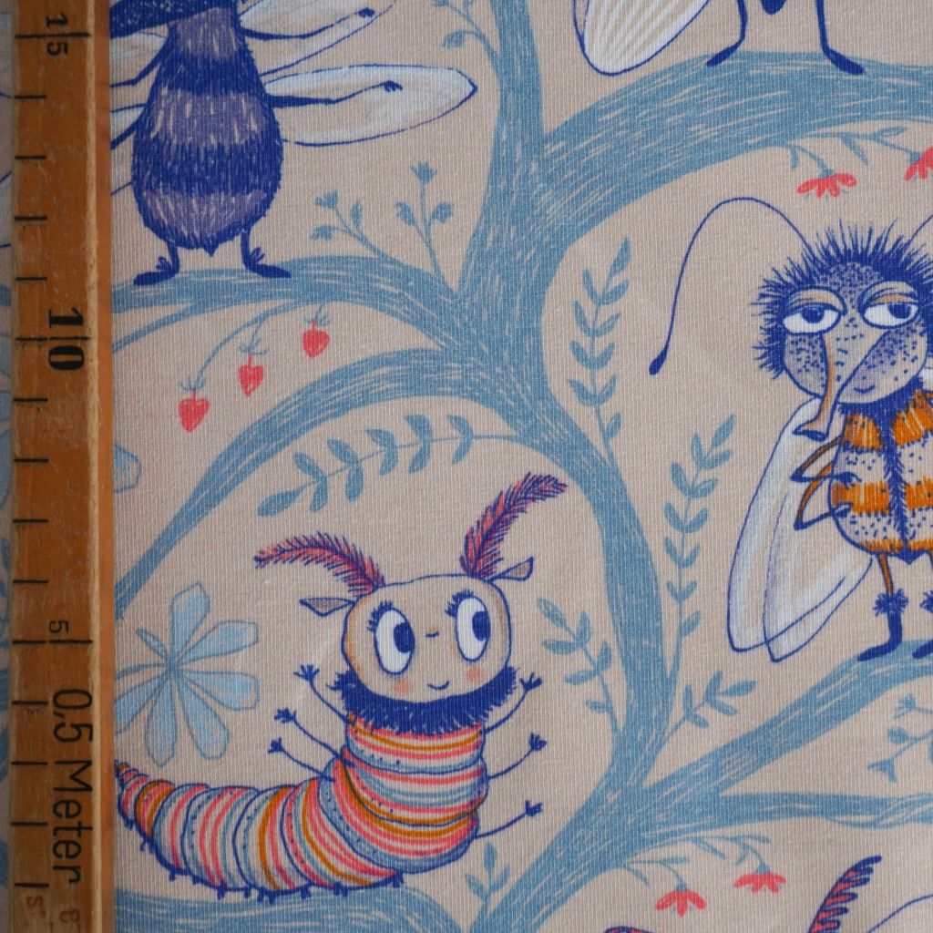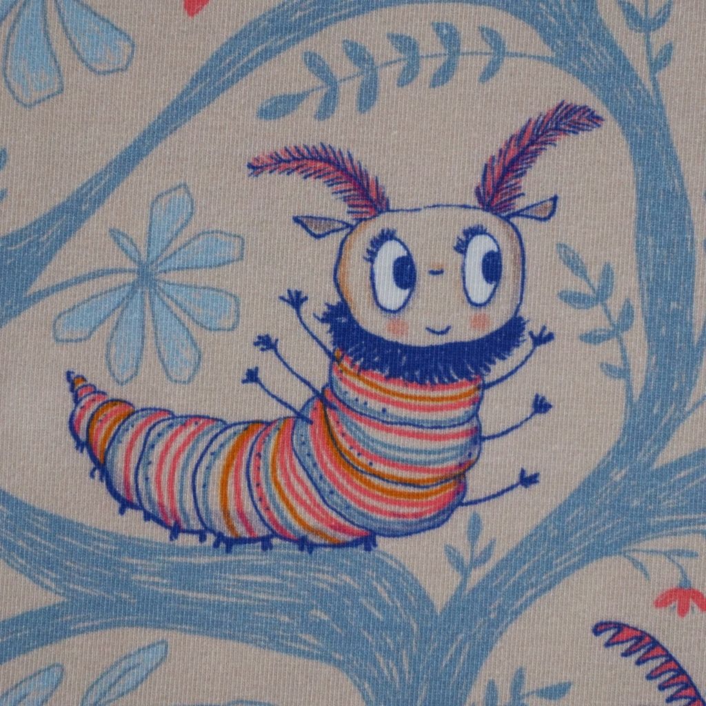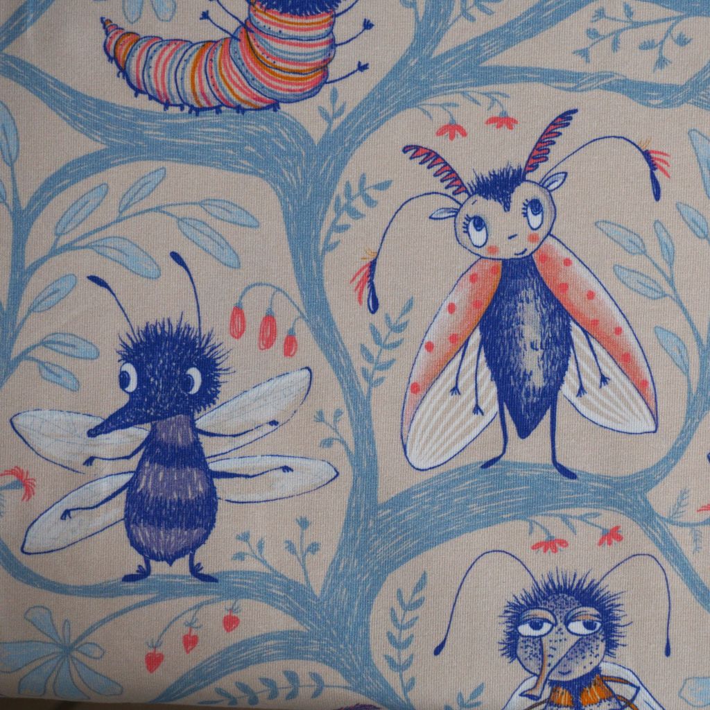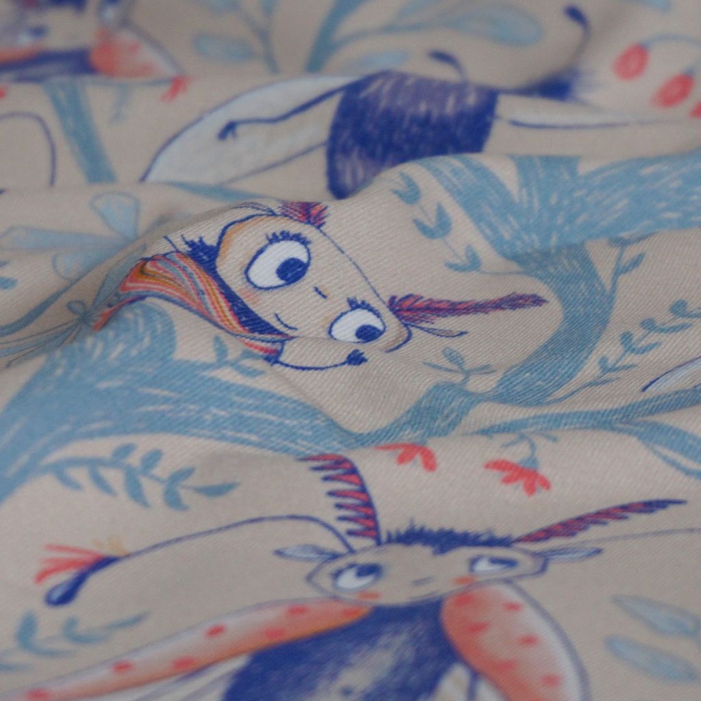 Dieser hochwertige Jersey ist aus Baumwolle mit einem kleinen Elasthan-Anteil für Elastizität und die optimale Passform. Der Singlejersey hat eine gute Qualität und das merkst du zu allererst beim Zuschneiden und anschließend beim Vernähen. Zwar rollt sich auch hier die Kante etwas ein, der Stoff hat jedoch genug Gewicht um gut auch mit der Haushaltsnähmaschine verarbeitet zu werden. Der ebenfalls hochwertige Motivdruck mit Reaktiv-Farben nach süßem Design von Susalabim spricht für sich und sieht auch nach vielen Wäschen frisch aus.