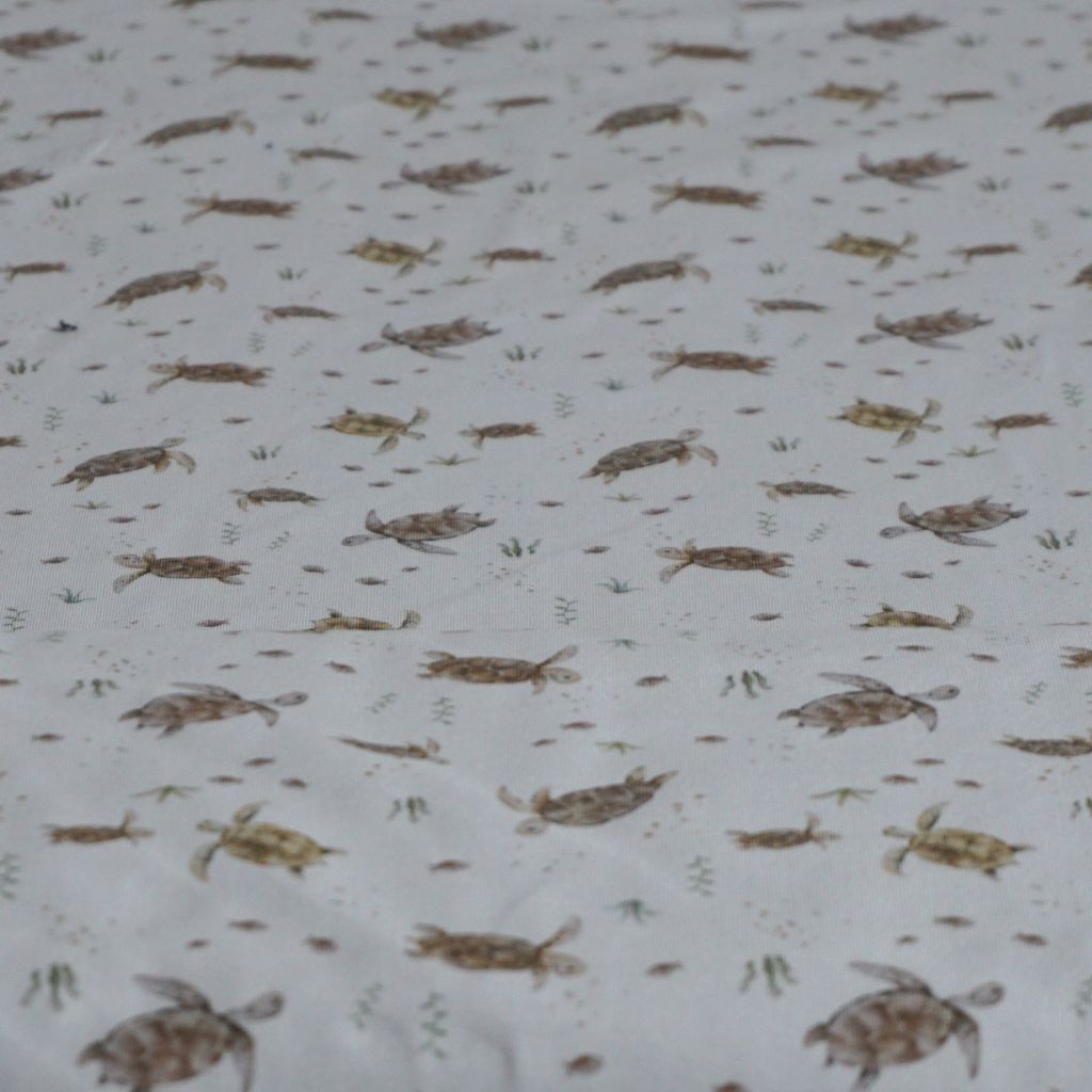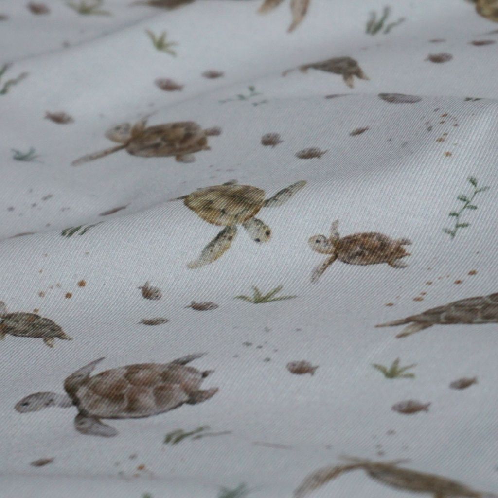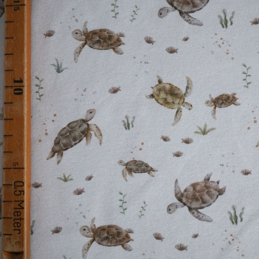 Dieser hochwertige Jersey ist aus Baumwolle mit einem kleinen Elasthan-Anteil für Elastizität und die optimale Passform. Der Singlejersey hat eine gute Qualität und das merkst du zu allererst beim Zuschneiden und anschließend beim Vernähen. Zwar rollt sich auch hier die Kante etwas ein, der Stoff hat jedoch genug Gewicht um gut auch mit der Haushaltsnähmaschine verarbeitet zu werden. Der ebenfalls hochwertige Motivdruck spricht für sich und sieht auch nach vielen Wäschen frisch aus.