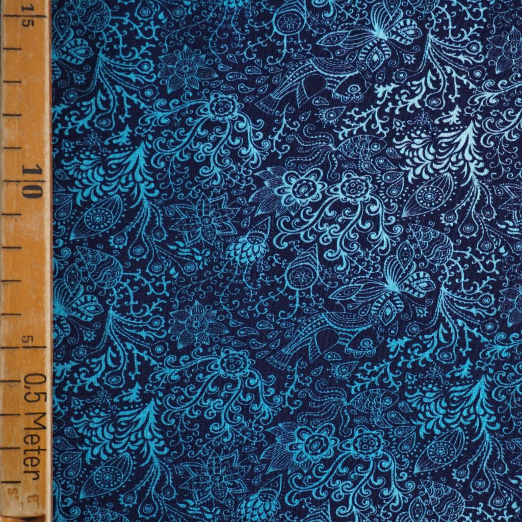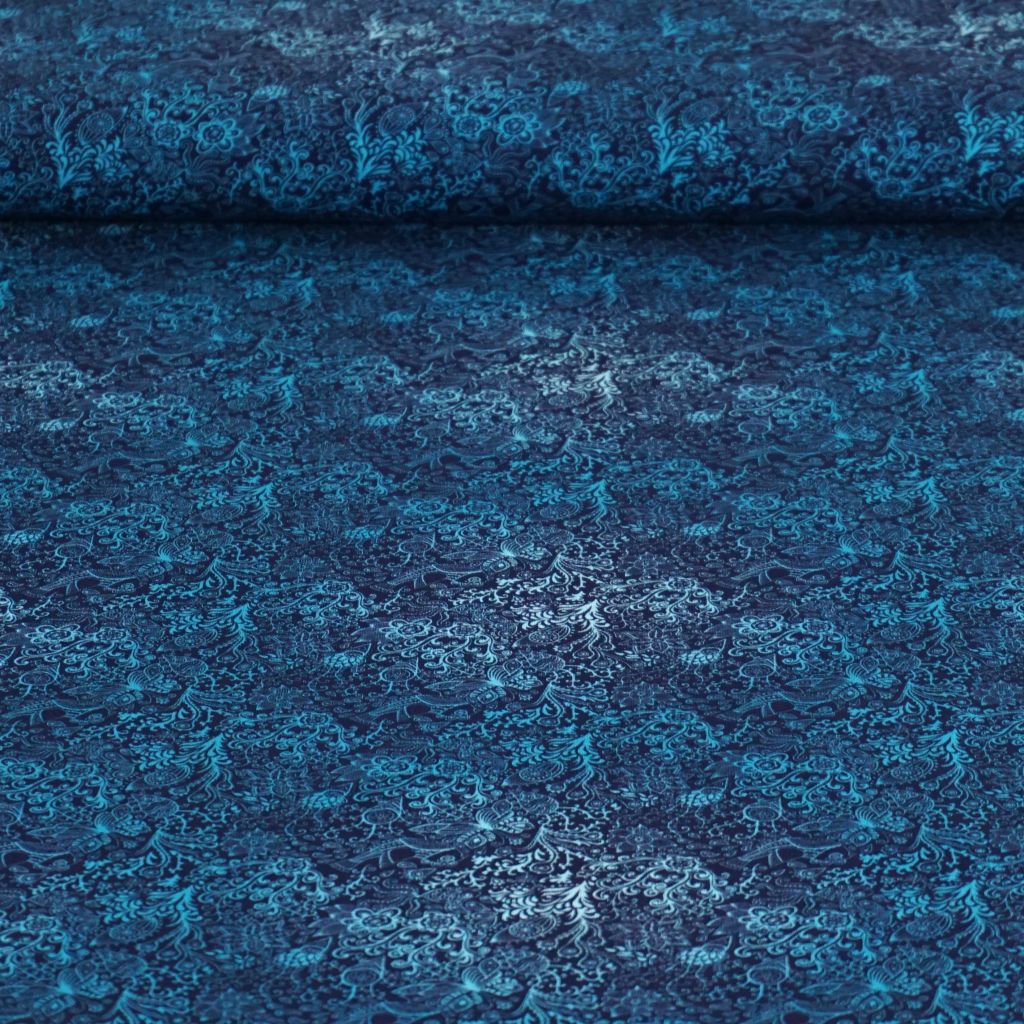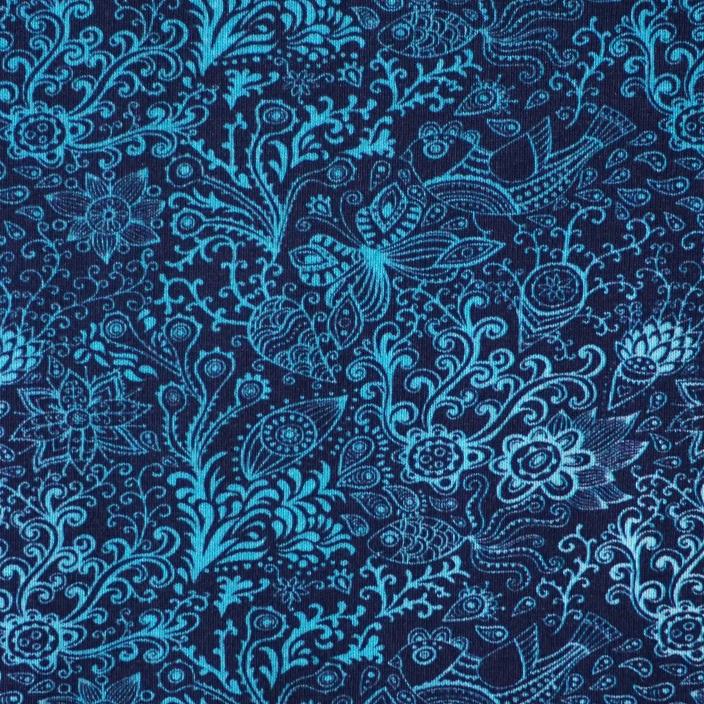 Baumwolljersey Zeichnungen Blüten Kringel blau türkis