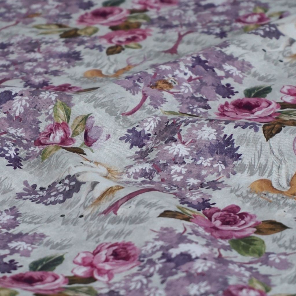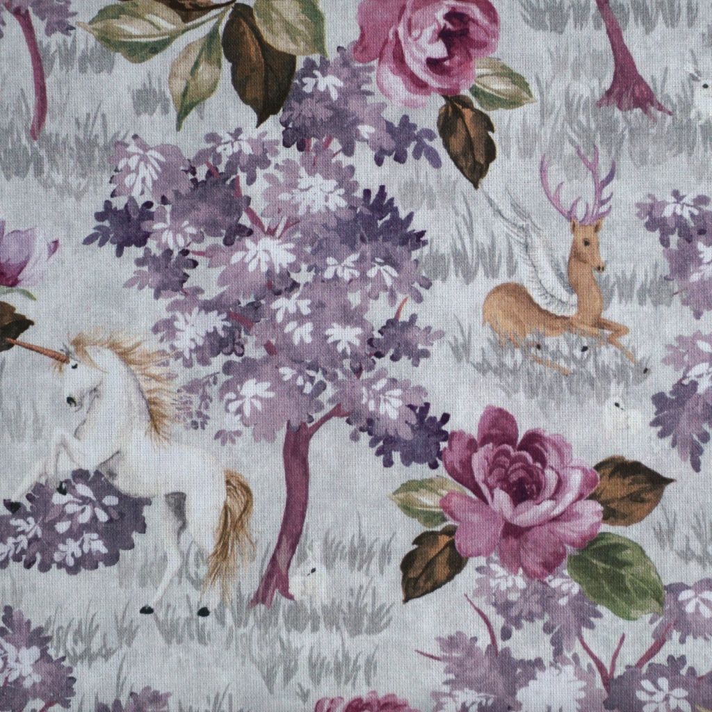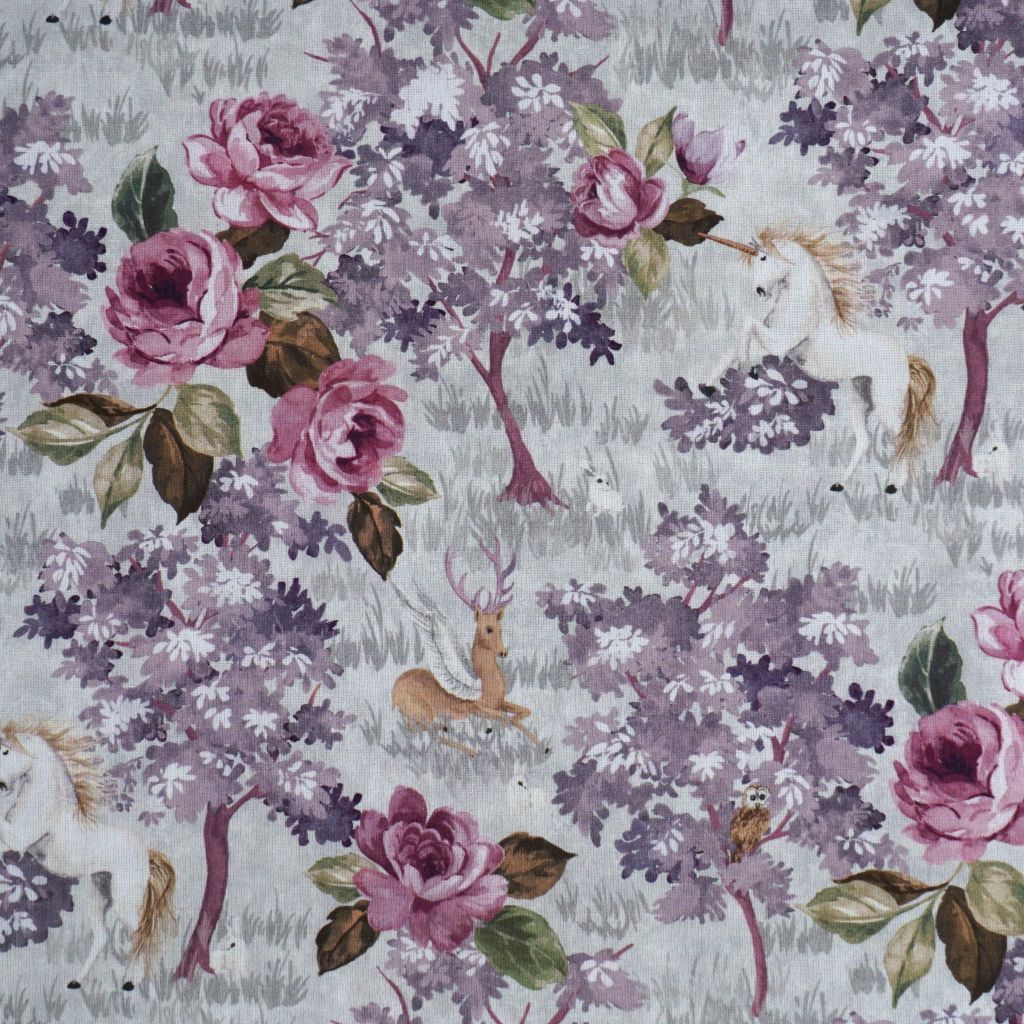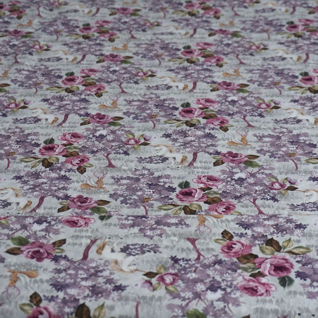 Baumwollstoff Motivdruck Einhorn Hirsch Rosen lila