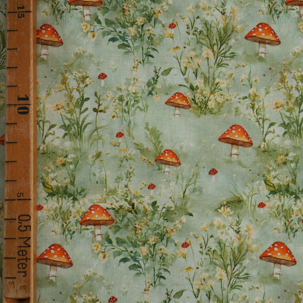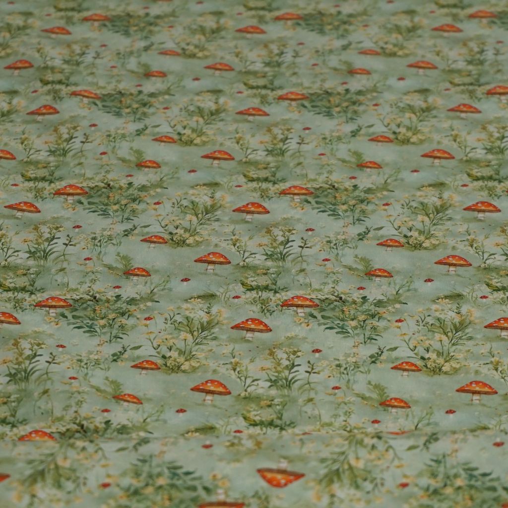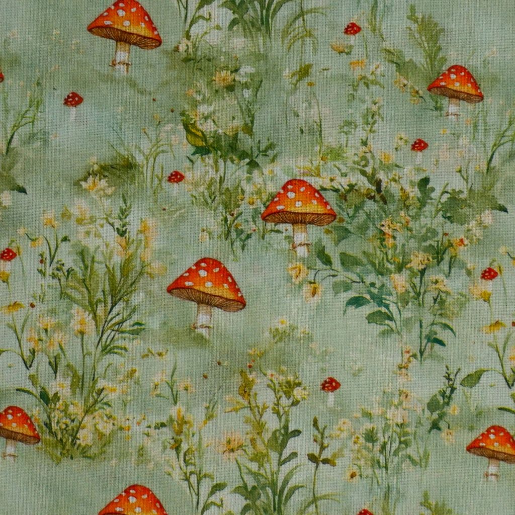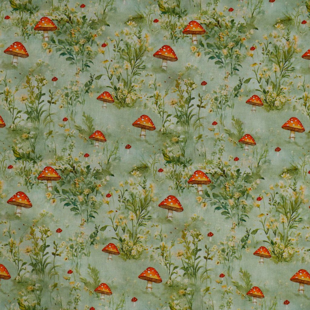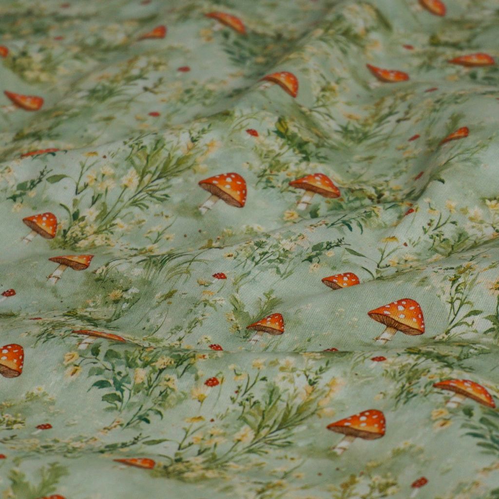 Baumwollstoff Motivdruck Fliegenpilze Gräser hellgrün