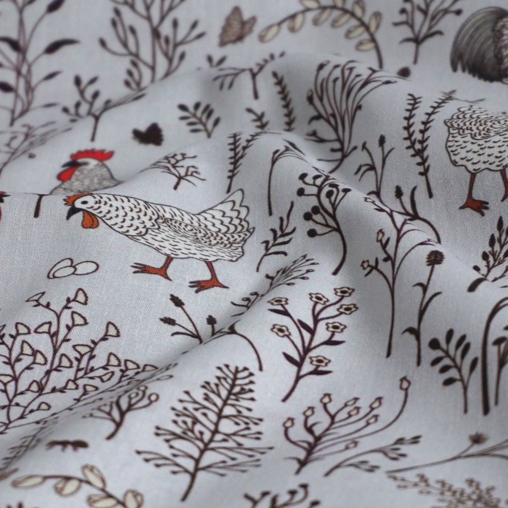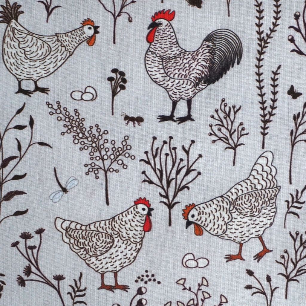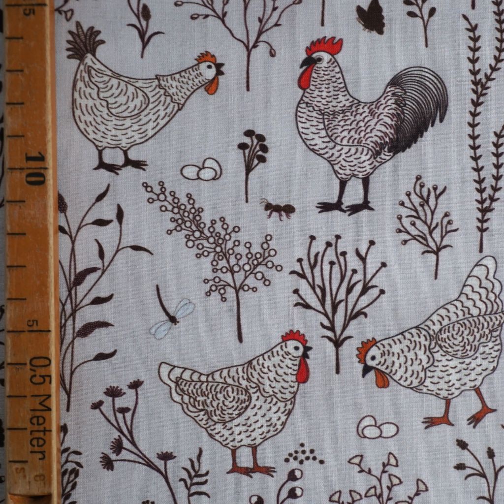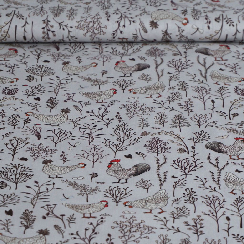 Baumwollstoff Motivdruck Hühner Hahn Zweige hell
