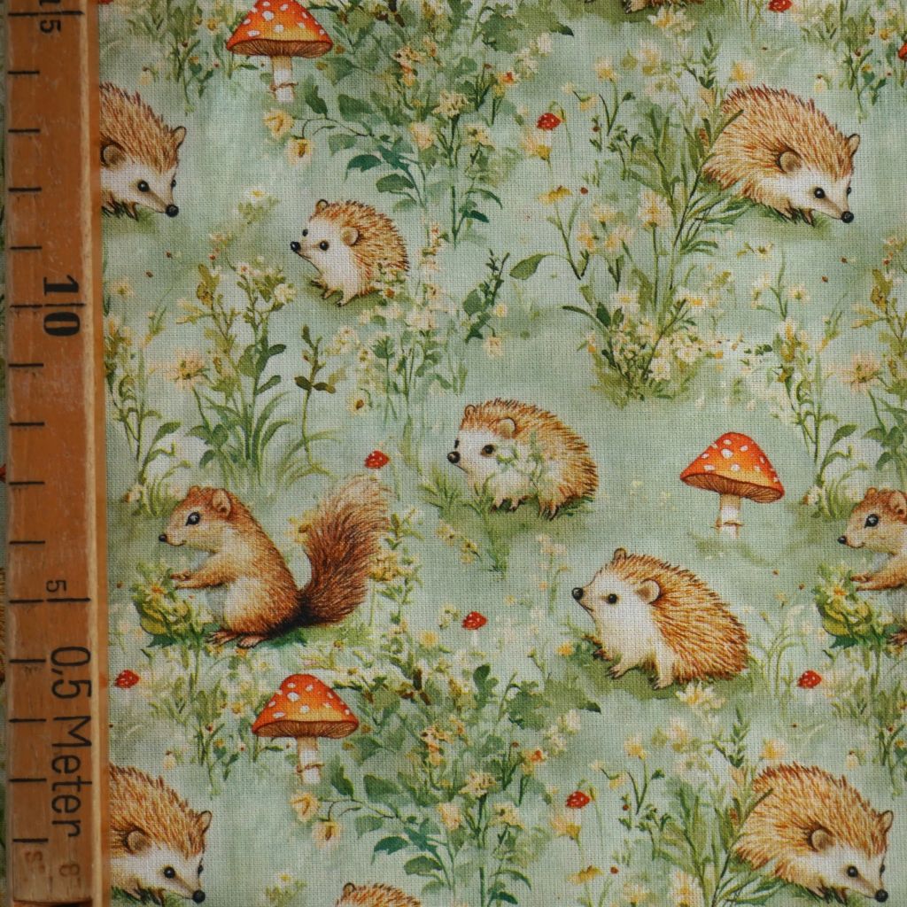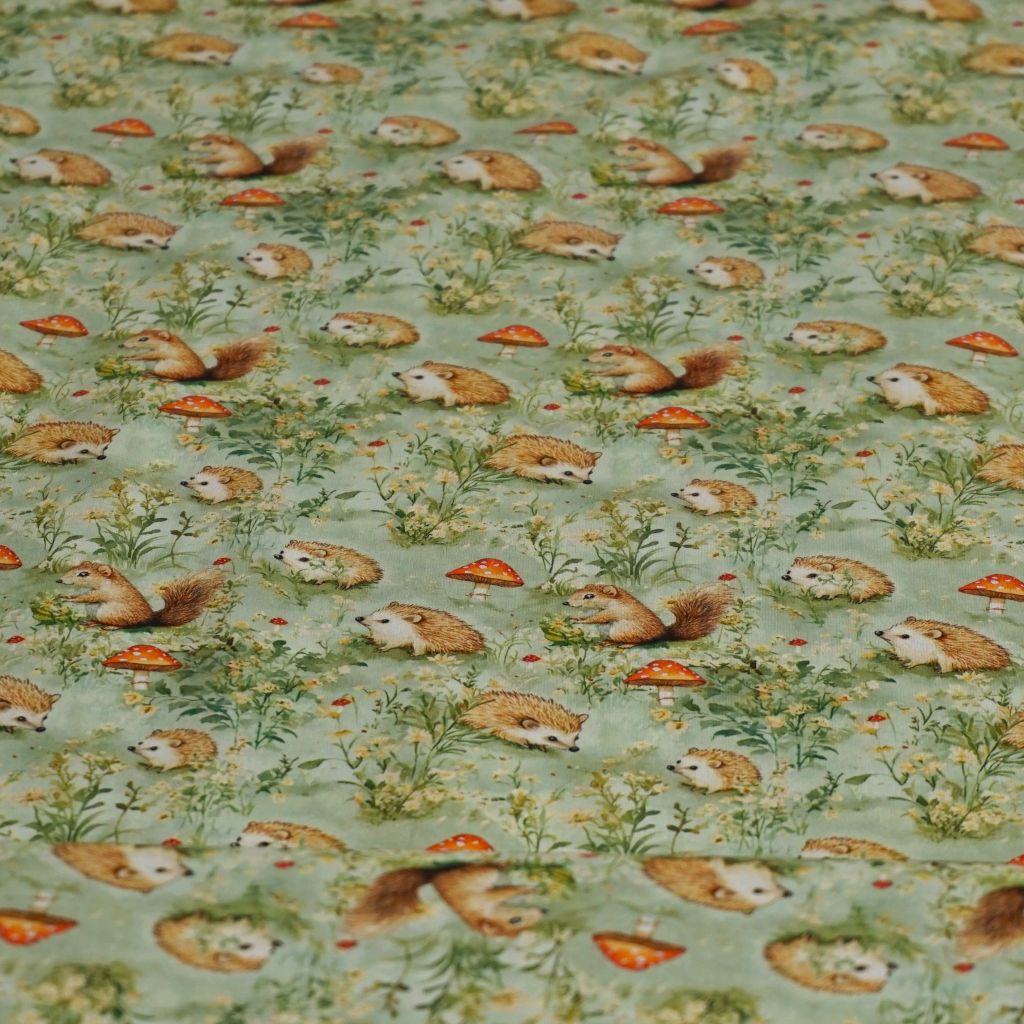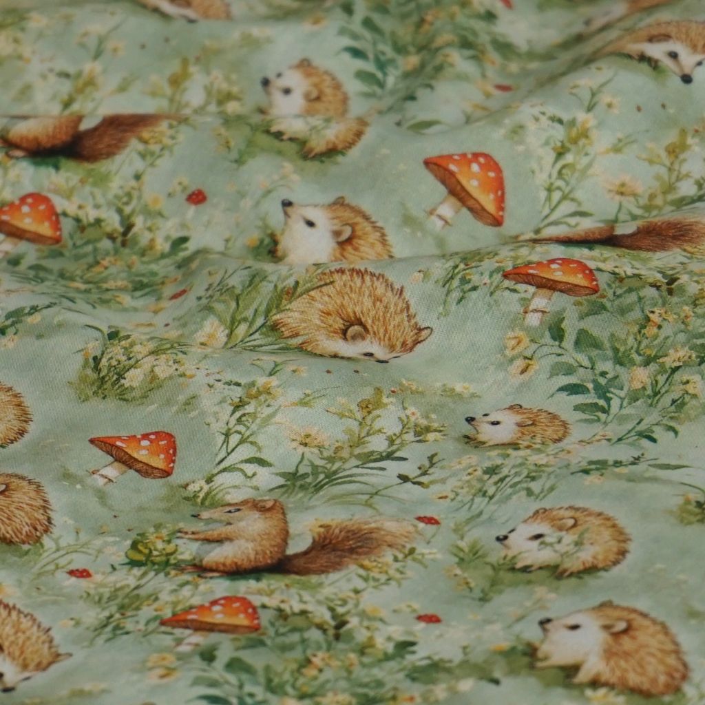 Baumwollstoff Motivdruck Igel Eichhörnchen Pilze hellgrün