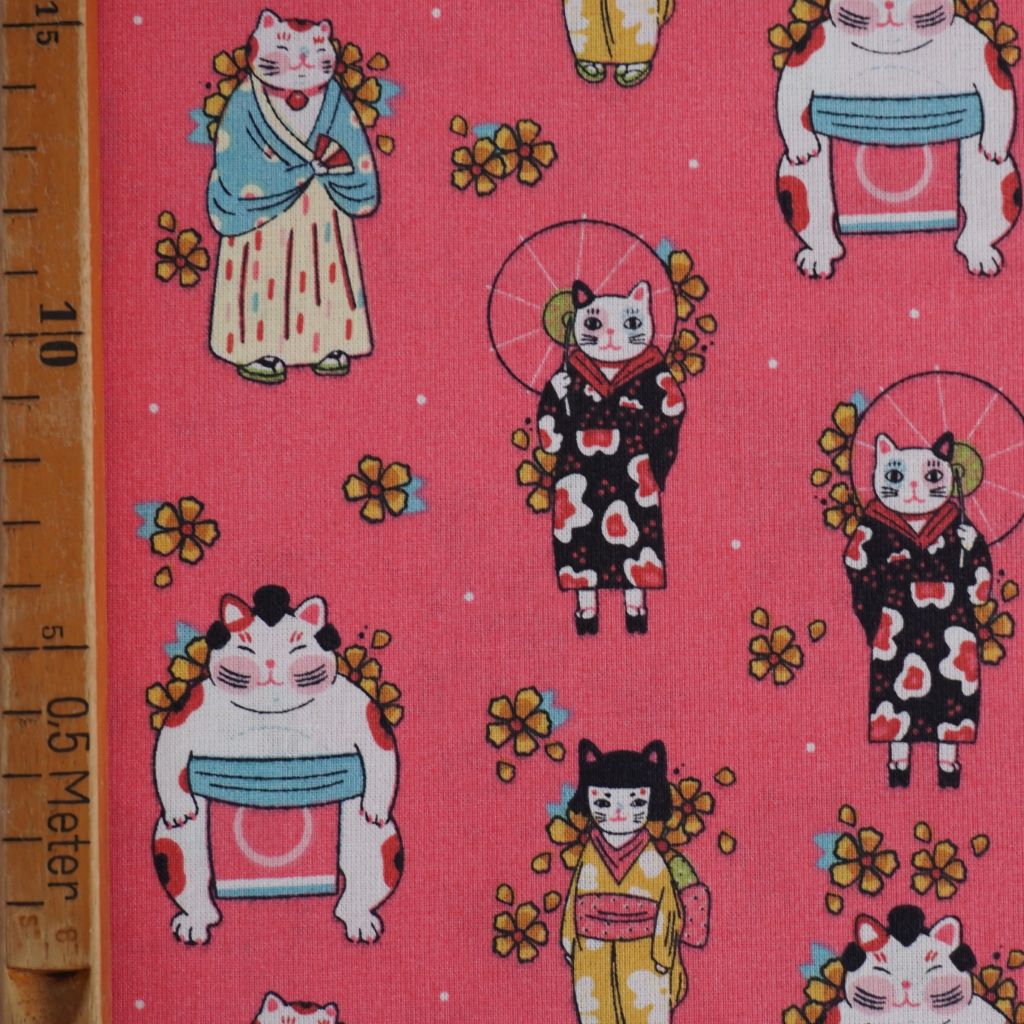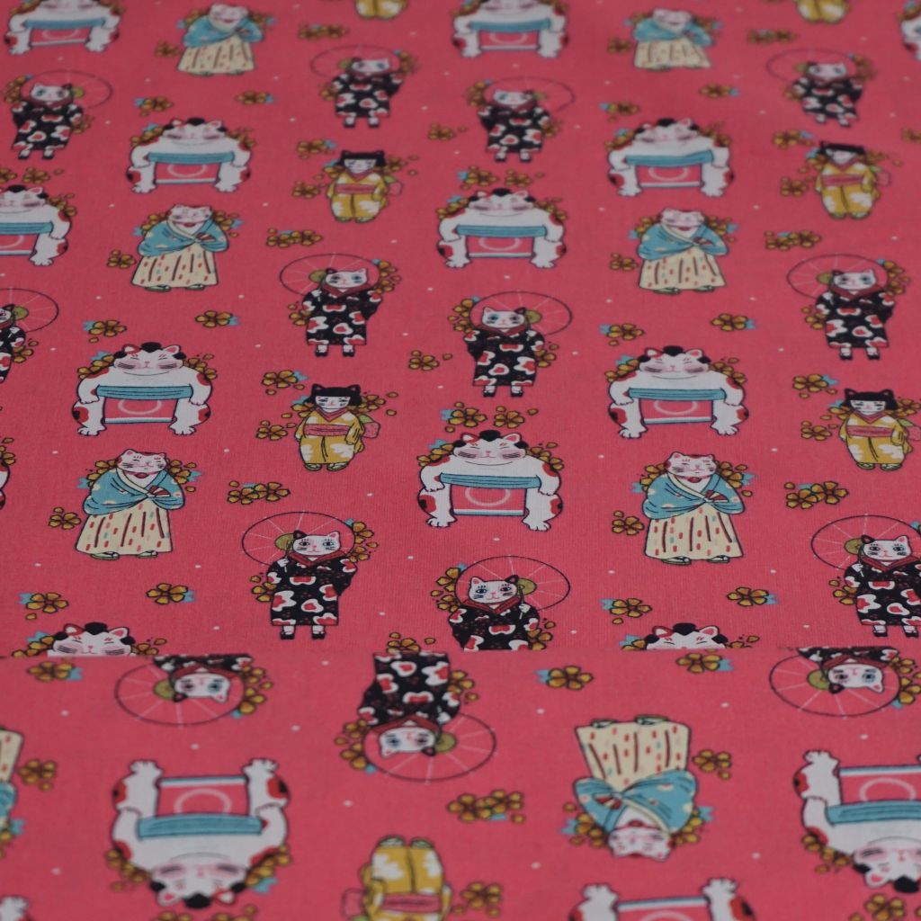 Baumwollstoff Motivdruck Katzen Japanstyle auf bonbonrosa