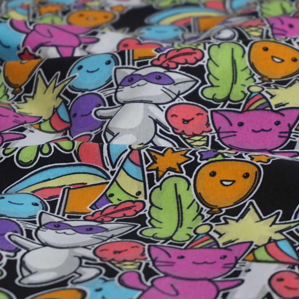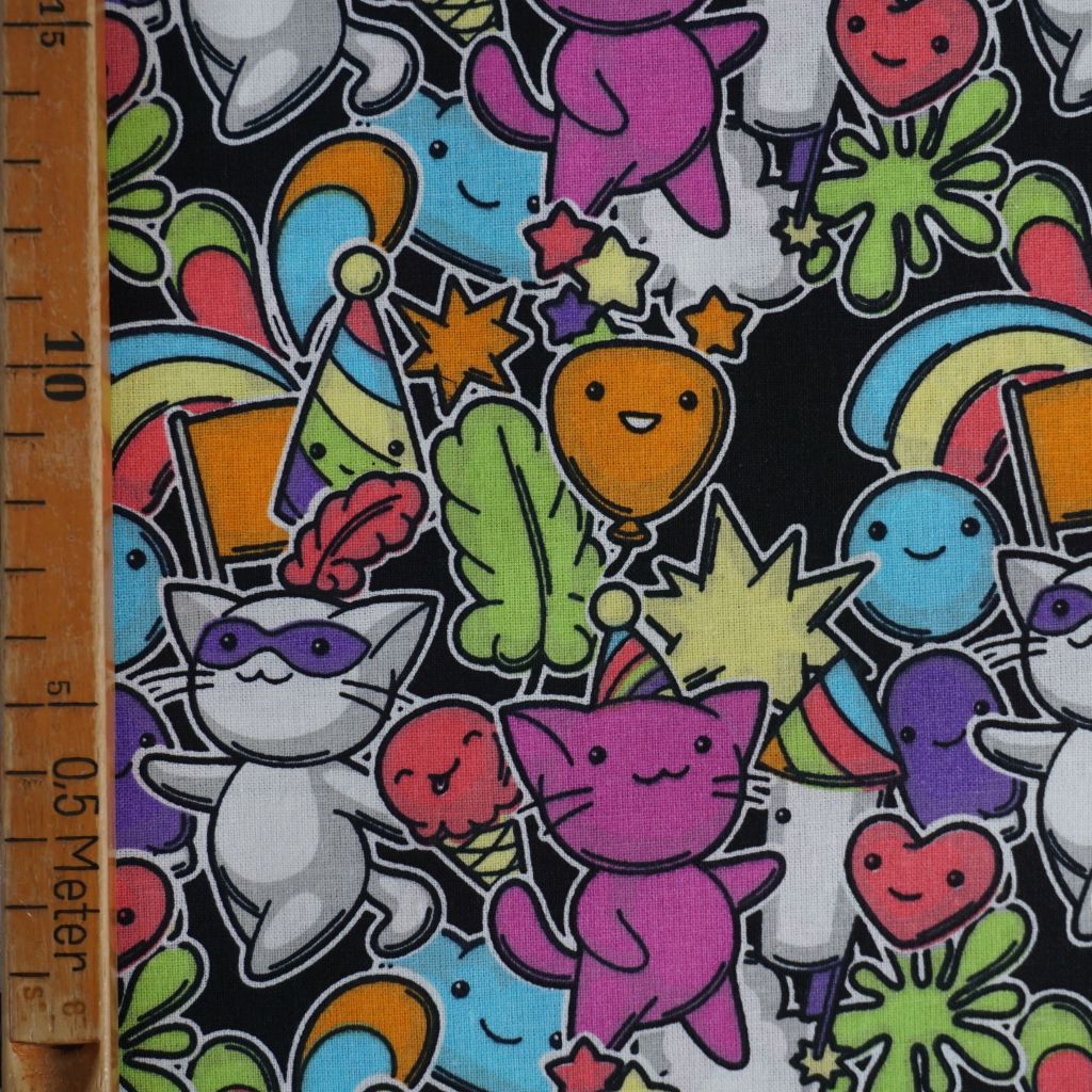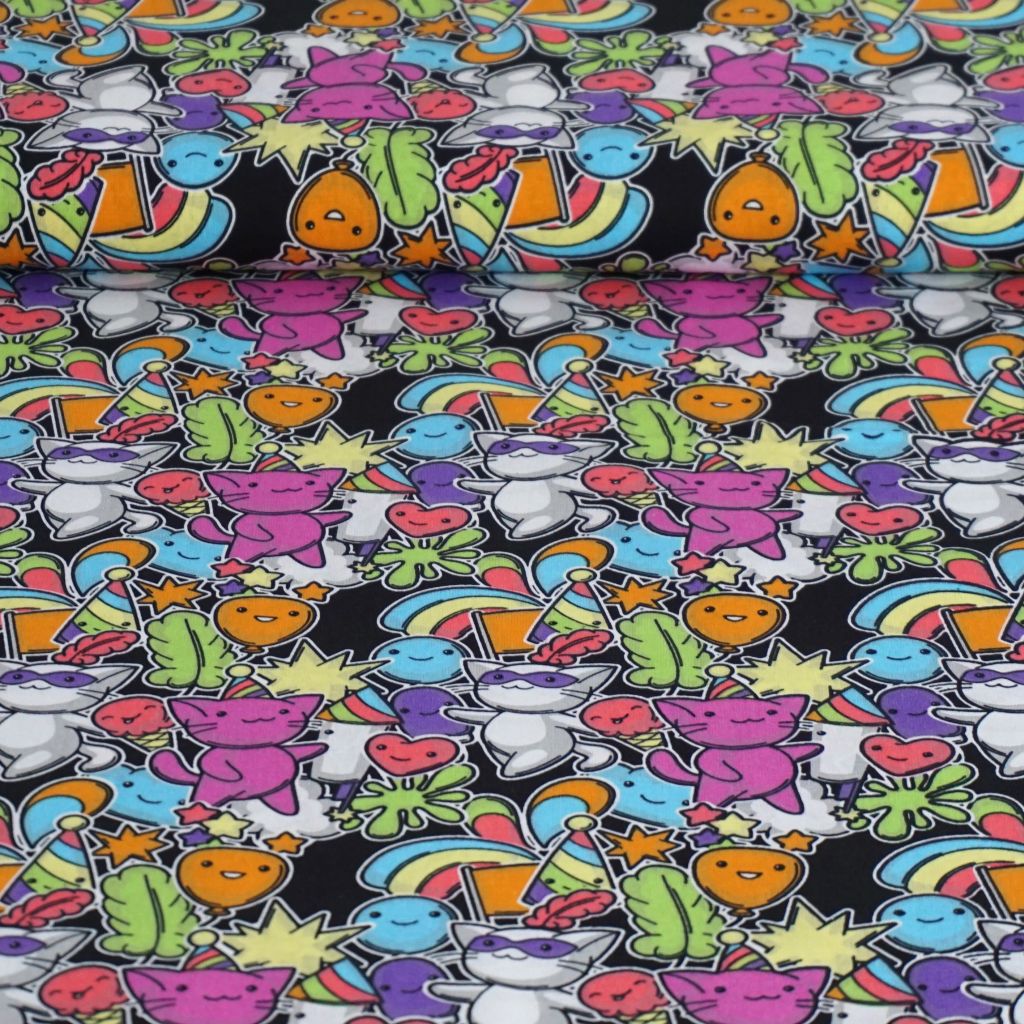 Baumwollstoff Motivdruck Manga Katzen Stern Herz bunt