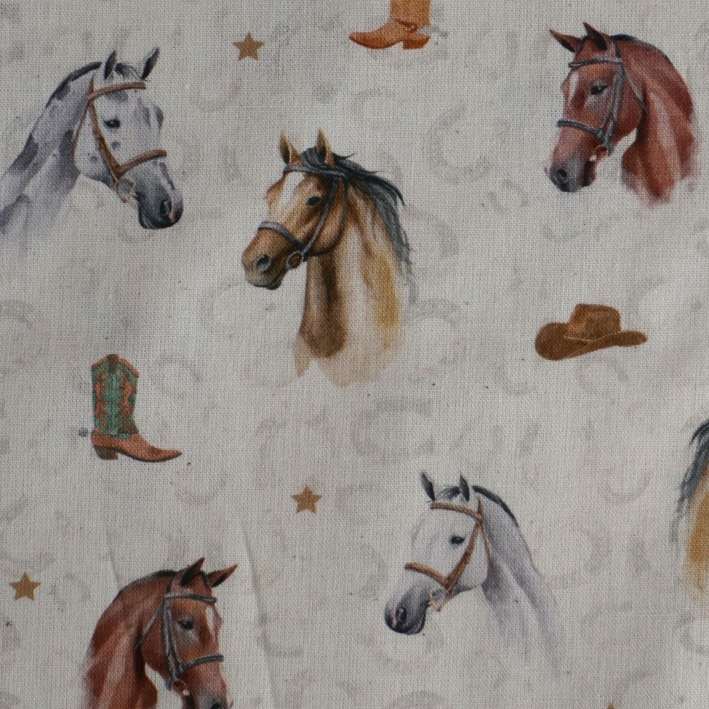 Baumwollstoff Motivdruck Pferdeköpfe Reitsachen hell