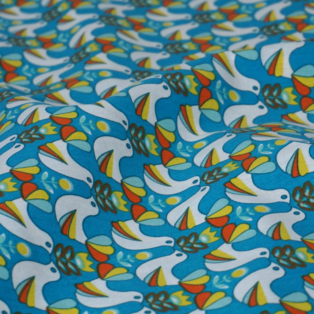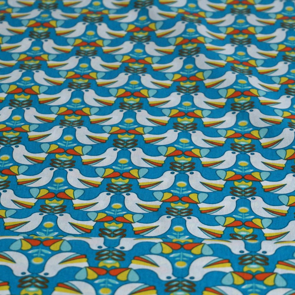 Baumwollstoff Motivdruck Retro Vögel türkisblau gelb orange