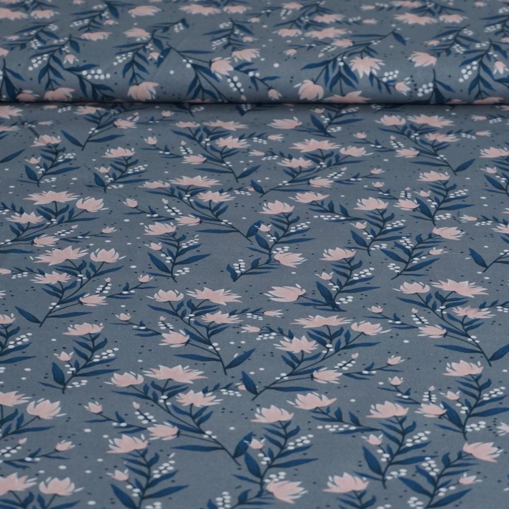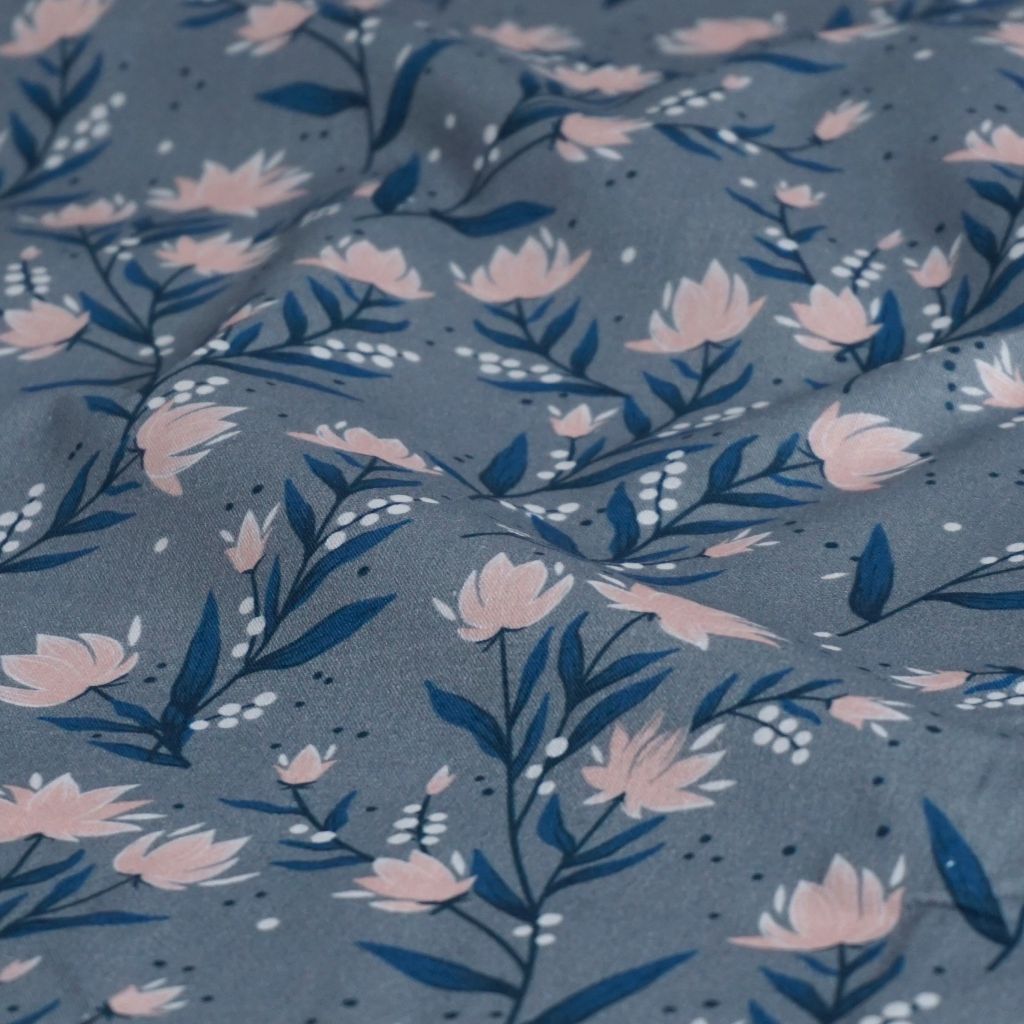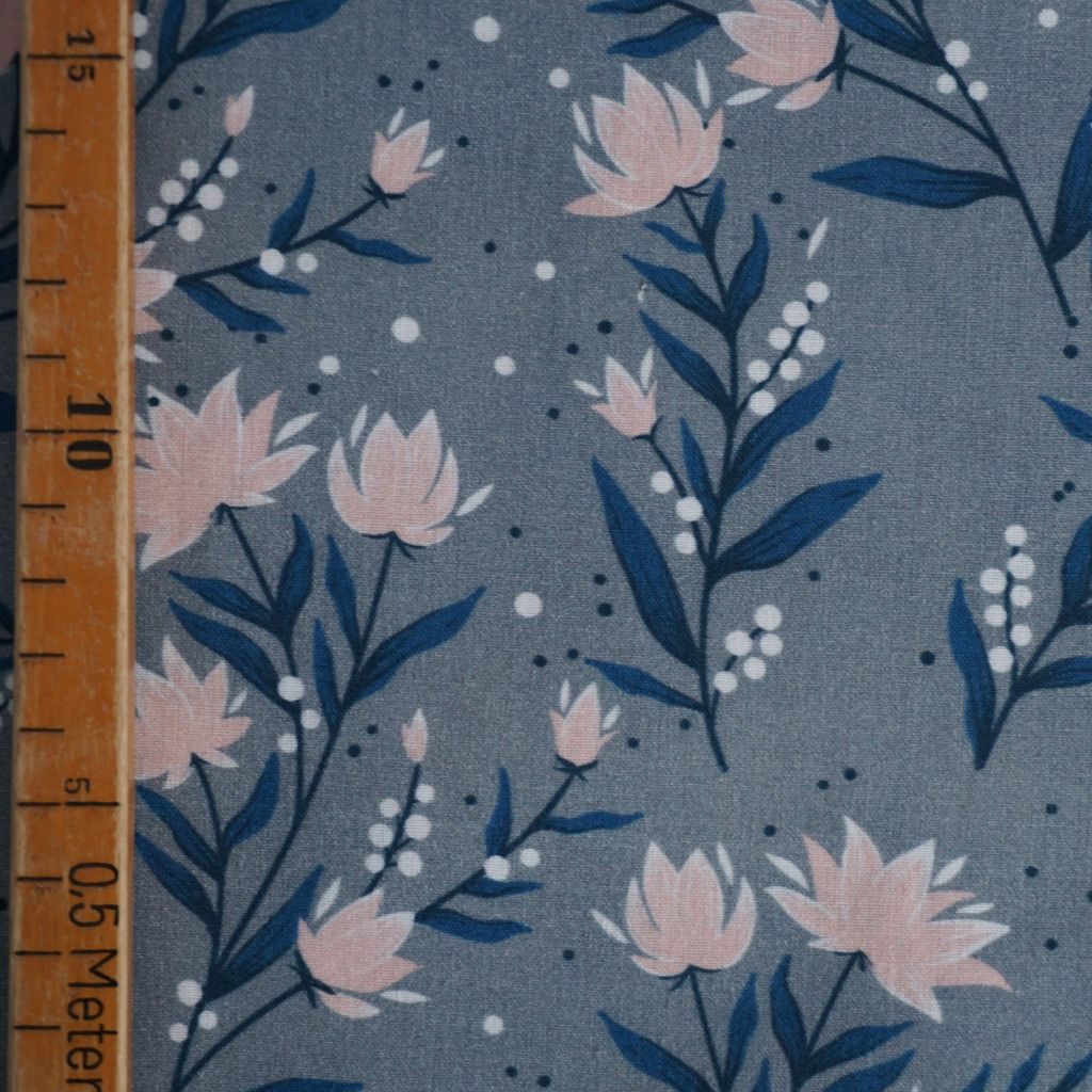 Baumwollstoff Motivdruck rosa Blüten auf grau