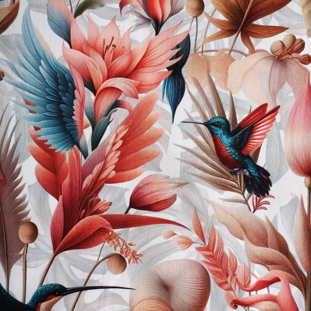 Dekostoff Halbpanama Kolibri mit Pflanzen rosa petrol