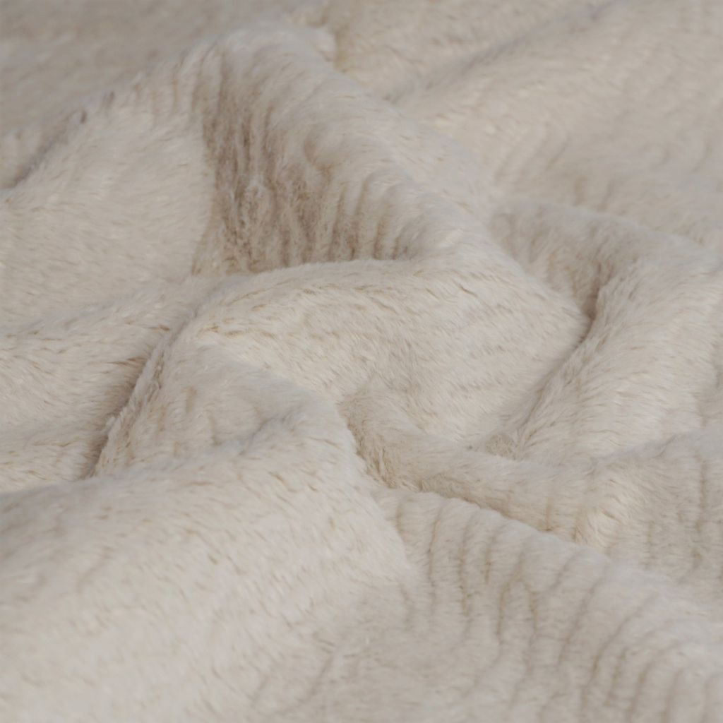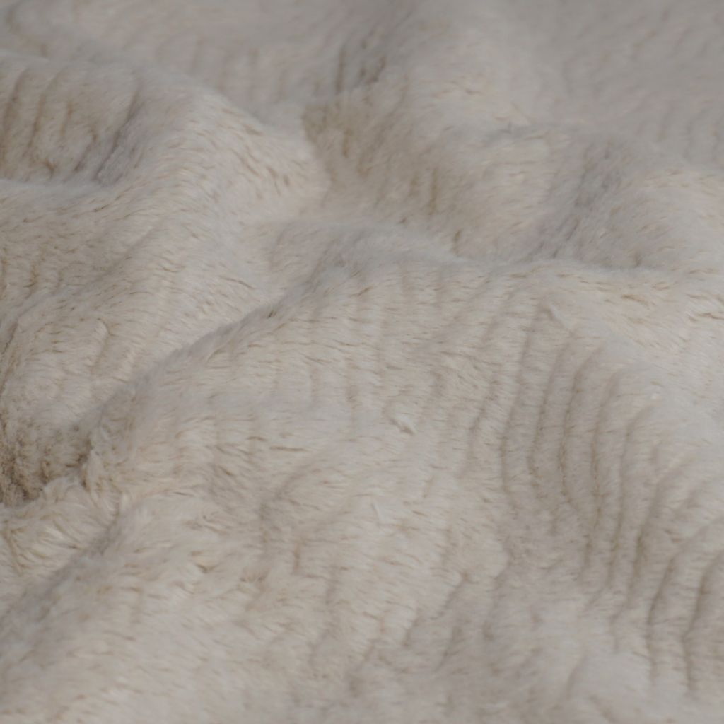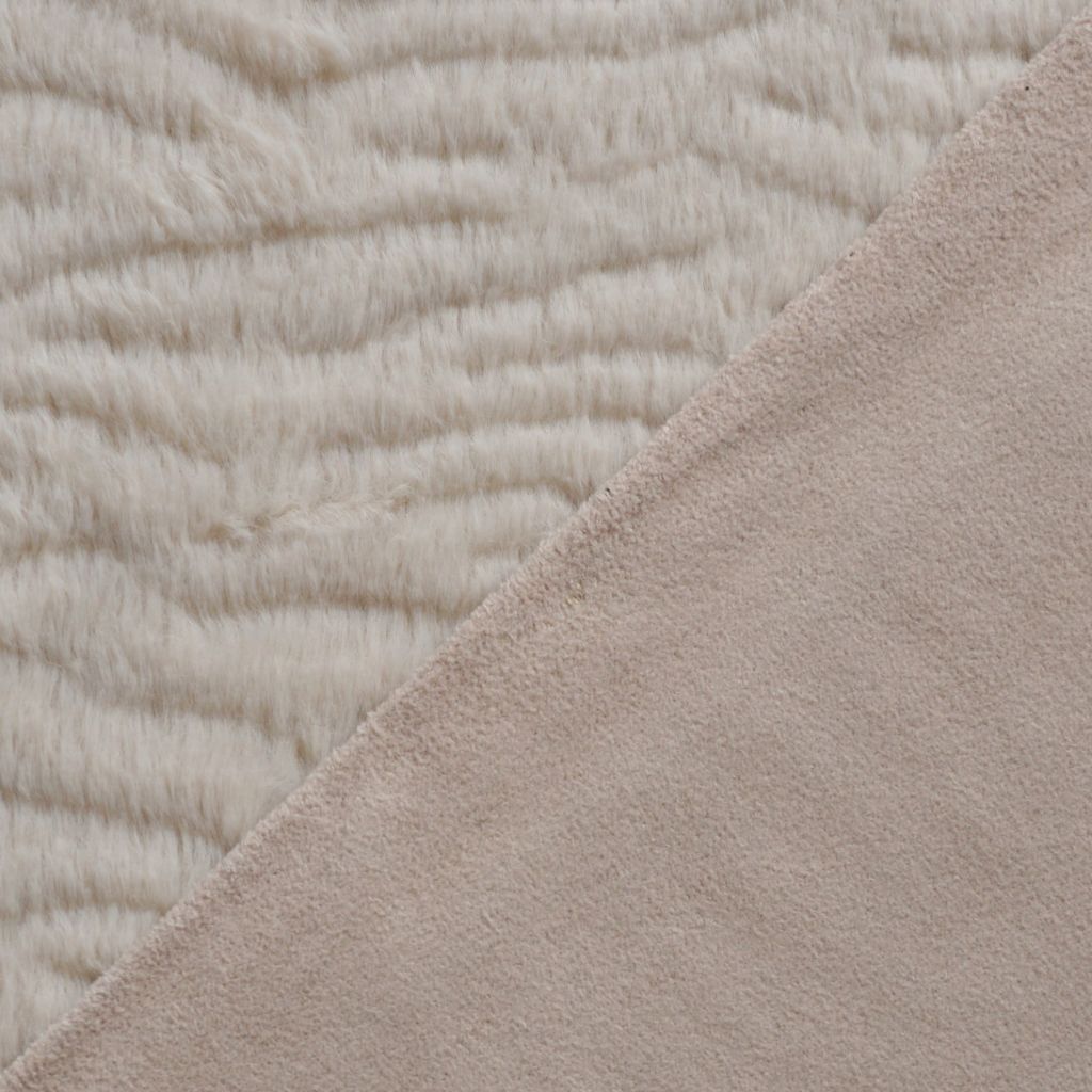 Der leicht gelockte helle Webpelz fühlt sich hochwertig an. Die Unterseite besteht aus einem weichen Kunstleder. So kann der Stoff ganz leicht und stabil vernäht werden.