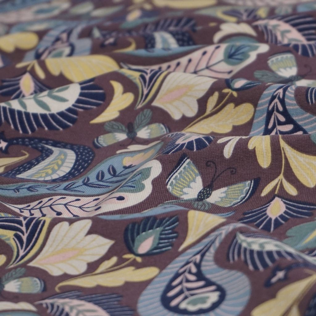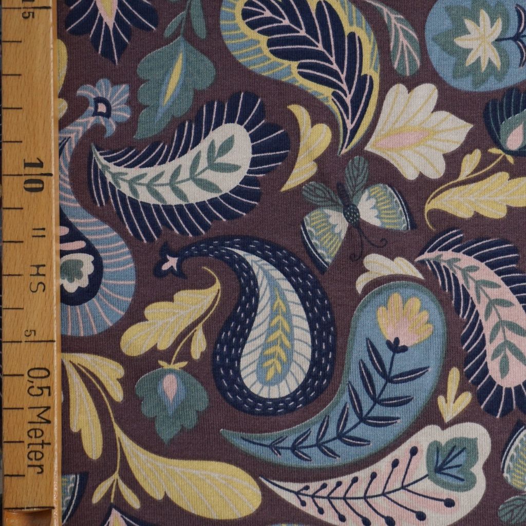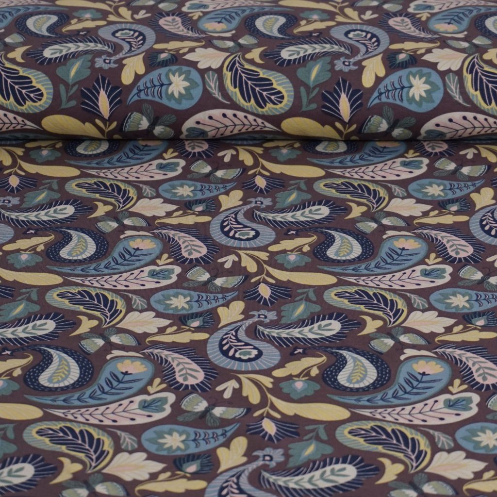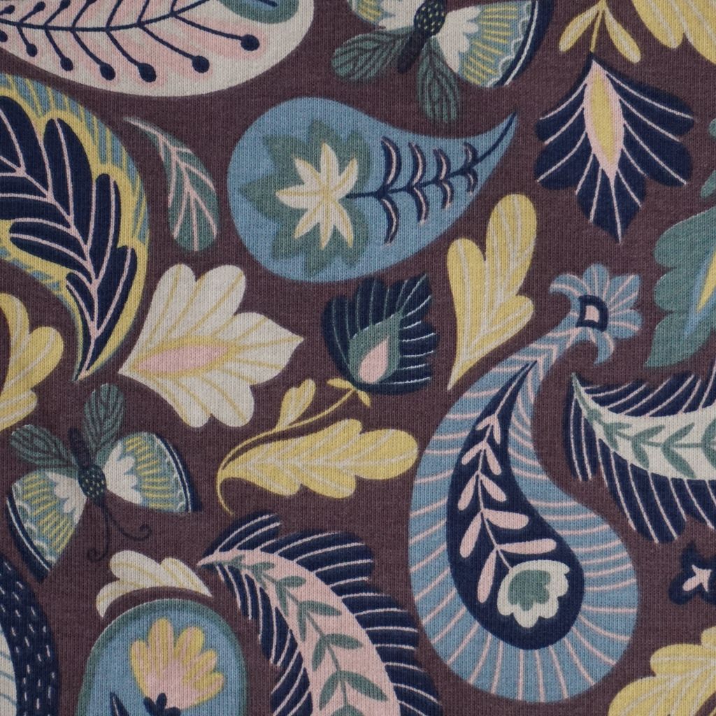 French Terry Paisley Blätter hellgelb rauchblau auf taupe