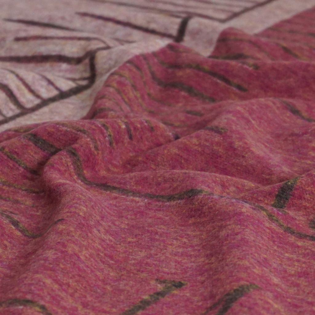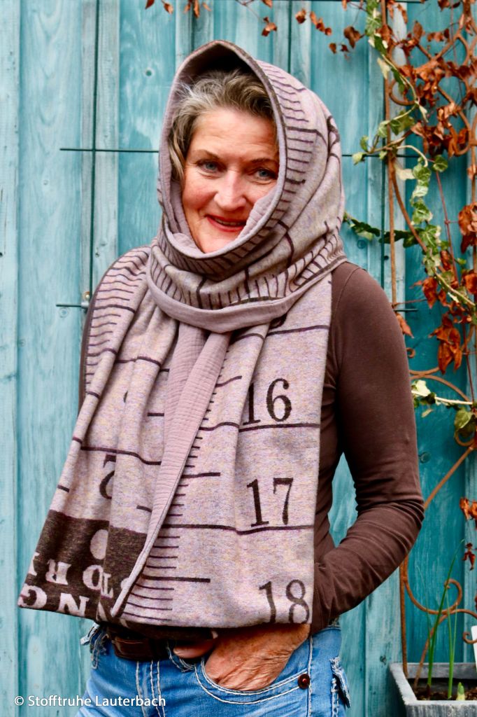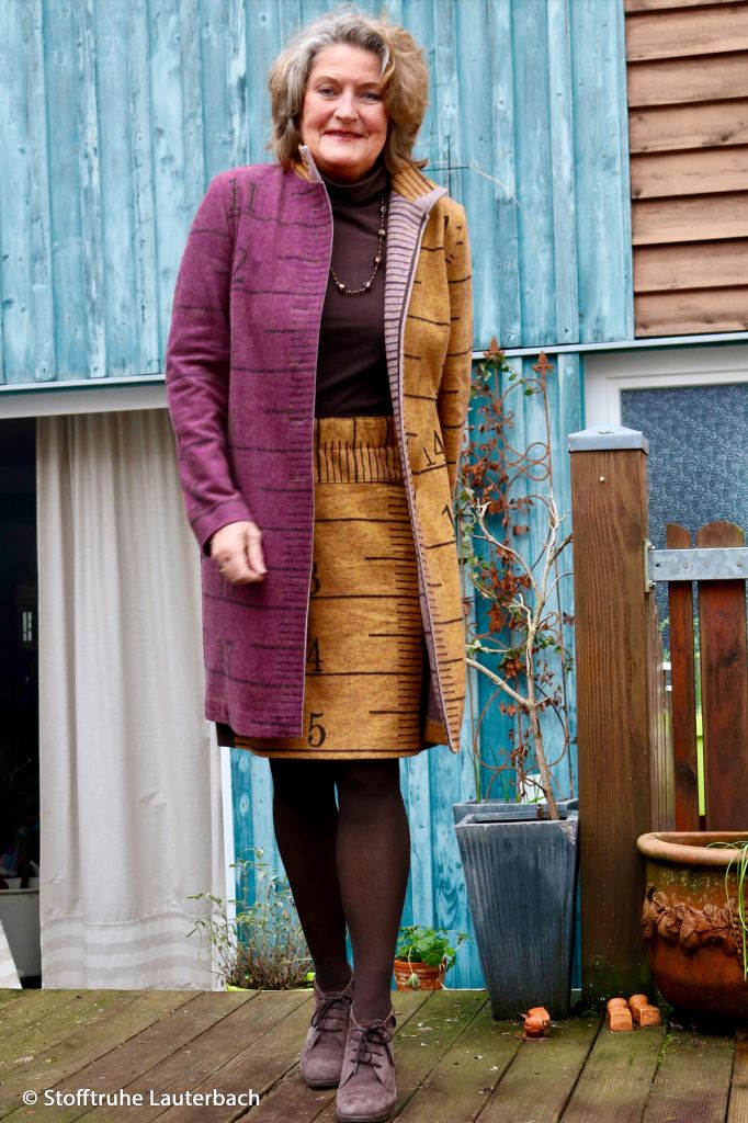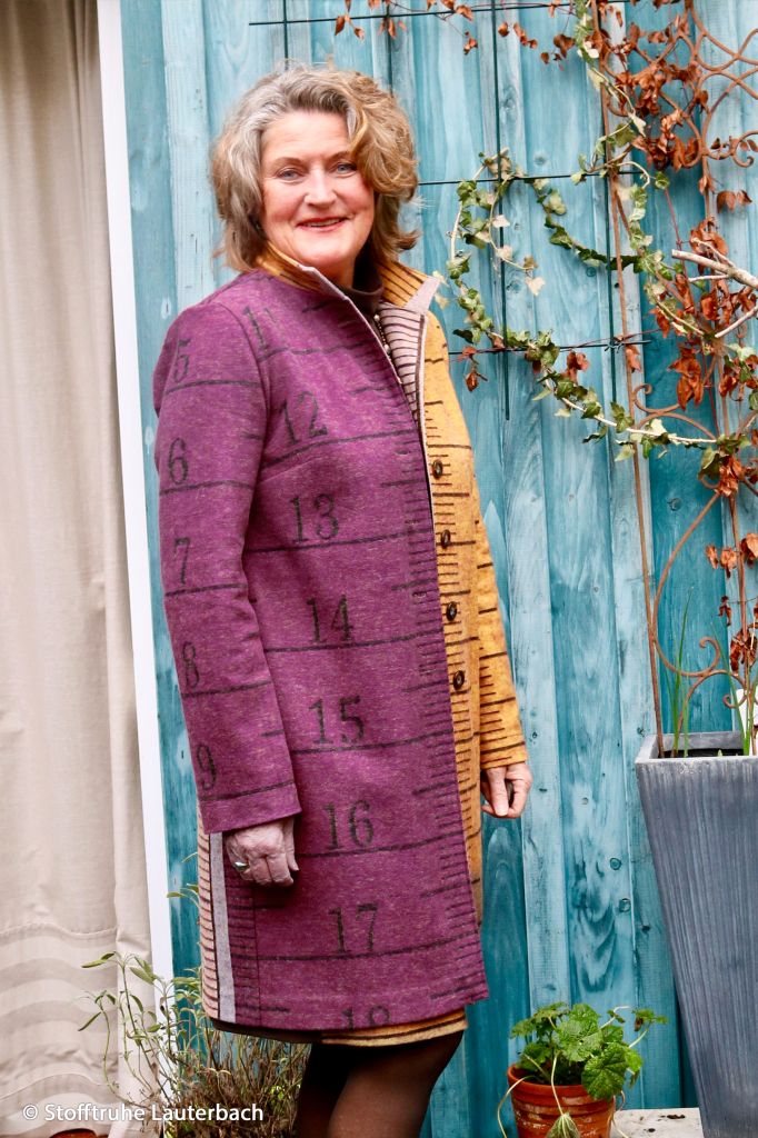 Extravagant: Das Panel mit drei aufgedruckten Maßbändern in violett, beige und senfgelb ist ein absoluter Hingucker. Der Stoff ist schön weich angeraut wie Flanell und leicht dehbar. Die Muster im Jacquard sind wie üblich nicht aufgedruckt, sondern mit farbigen Garnen eingestrickt. Den schönen Strickstoff kannst du wie einen leichten Sweat verarbeiten. Das Panel hat eine Länge von 2,50m.