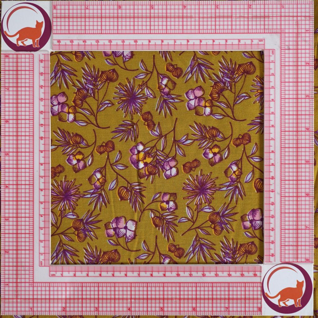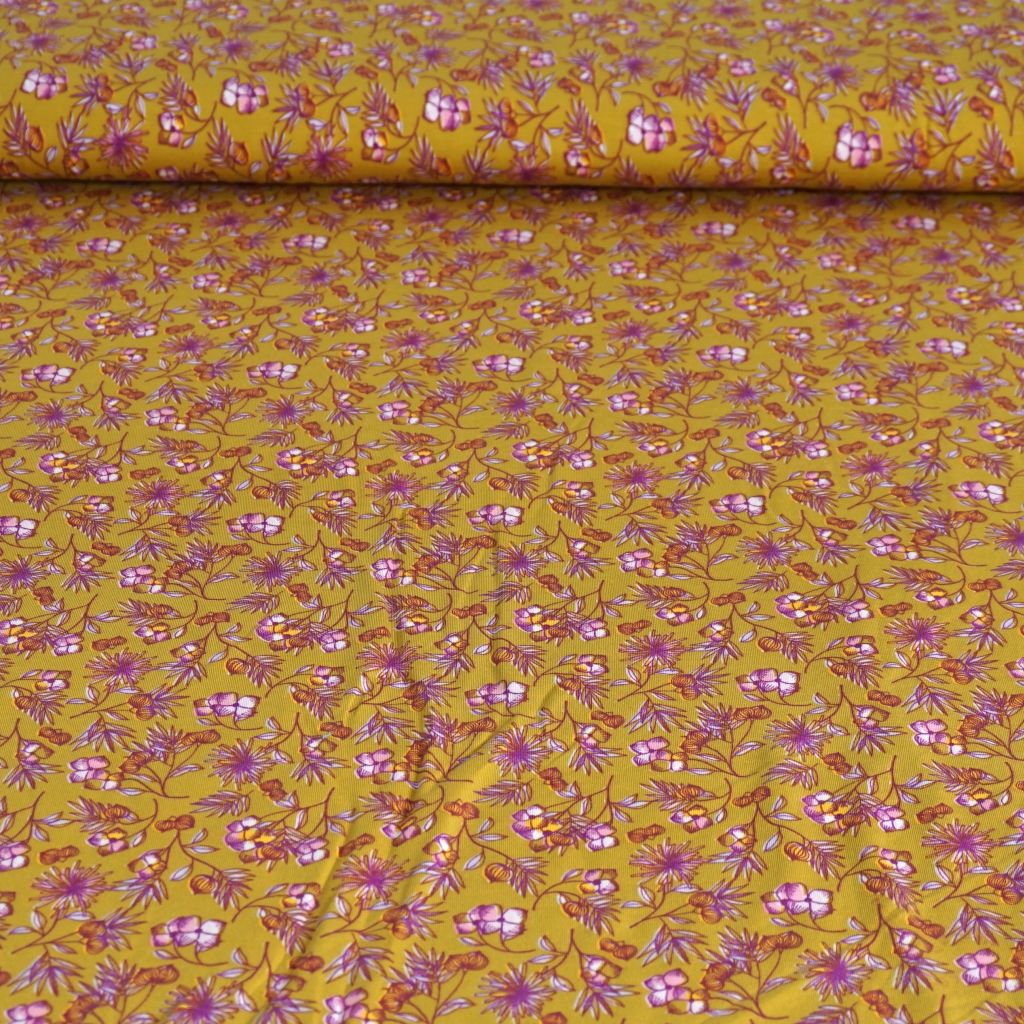 Modaljersey Blümchen violett auf senfgelb