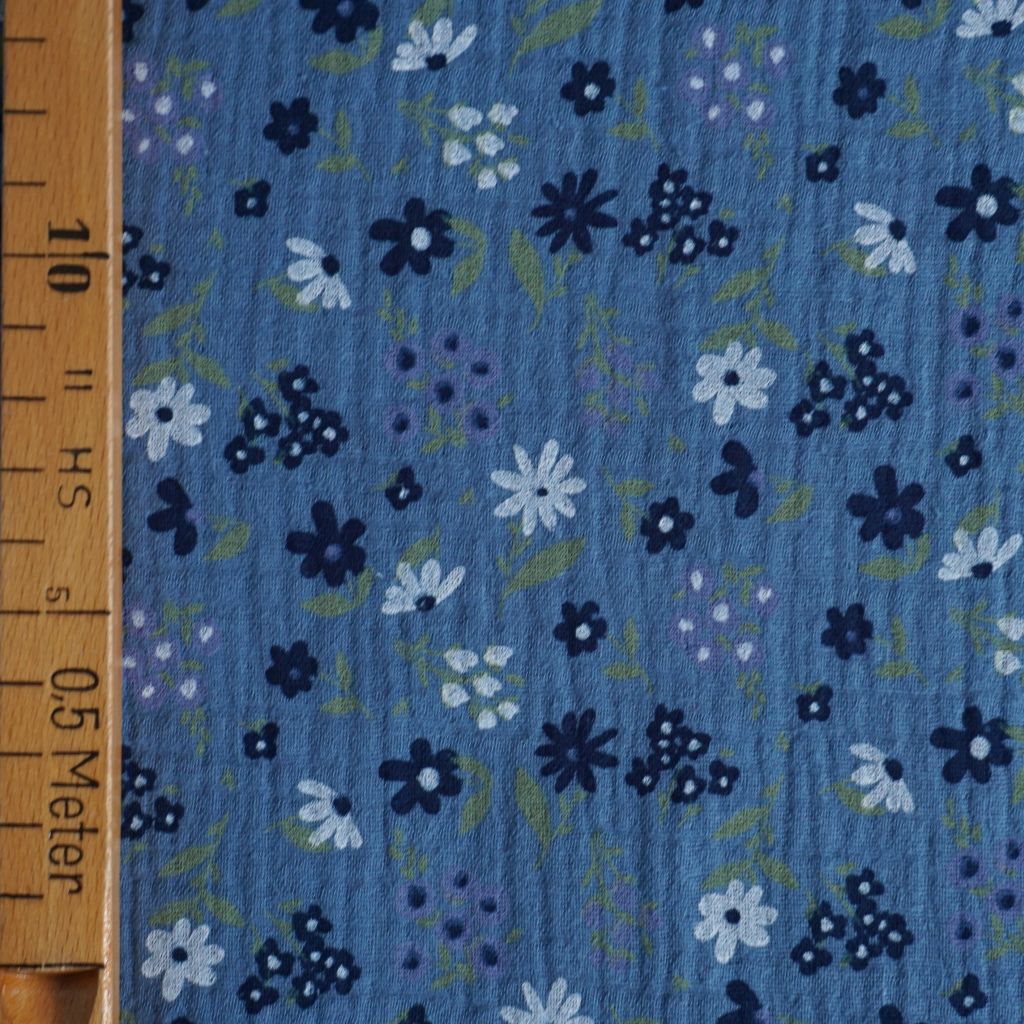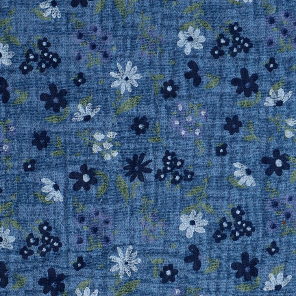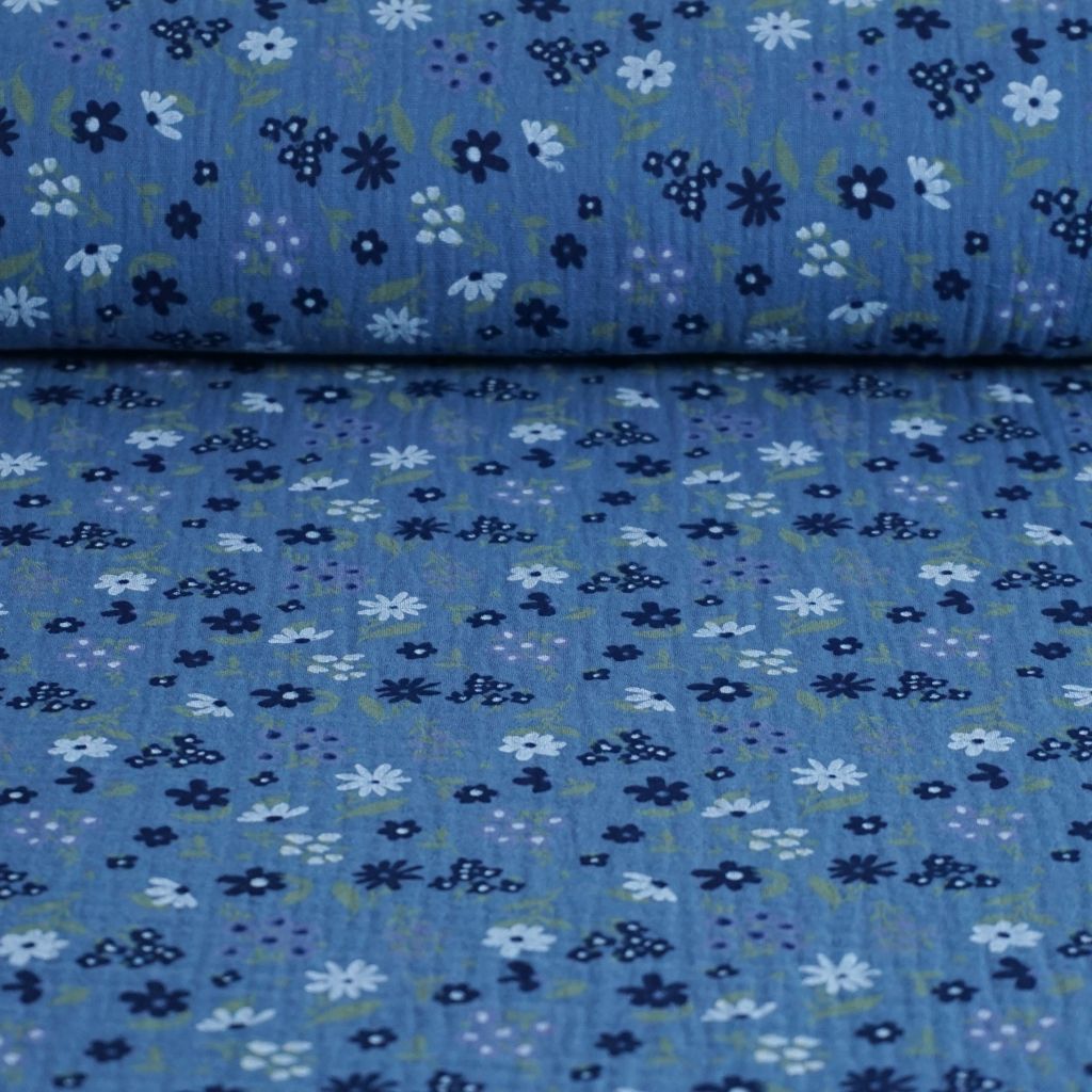 Musselin Double Gauze blaue weiße Blümchen auf jeansblau