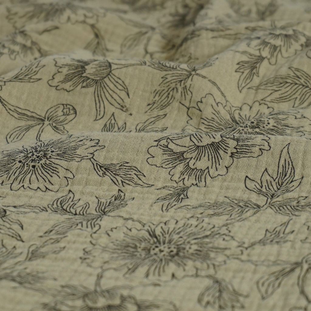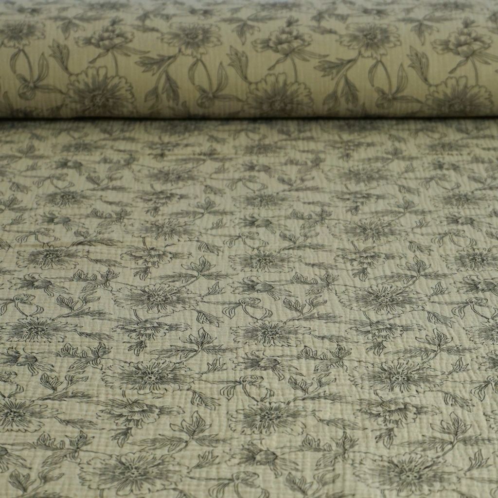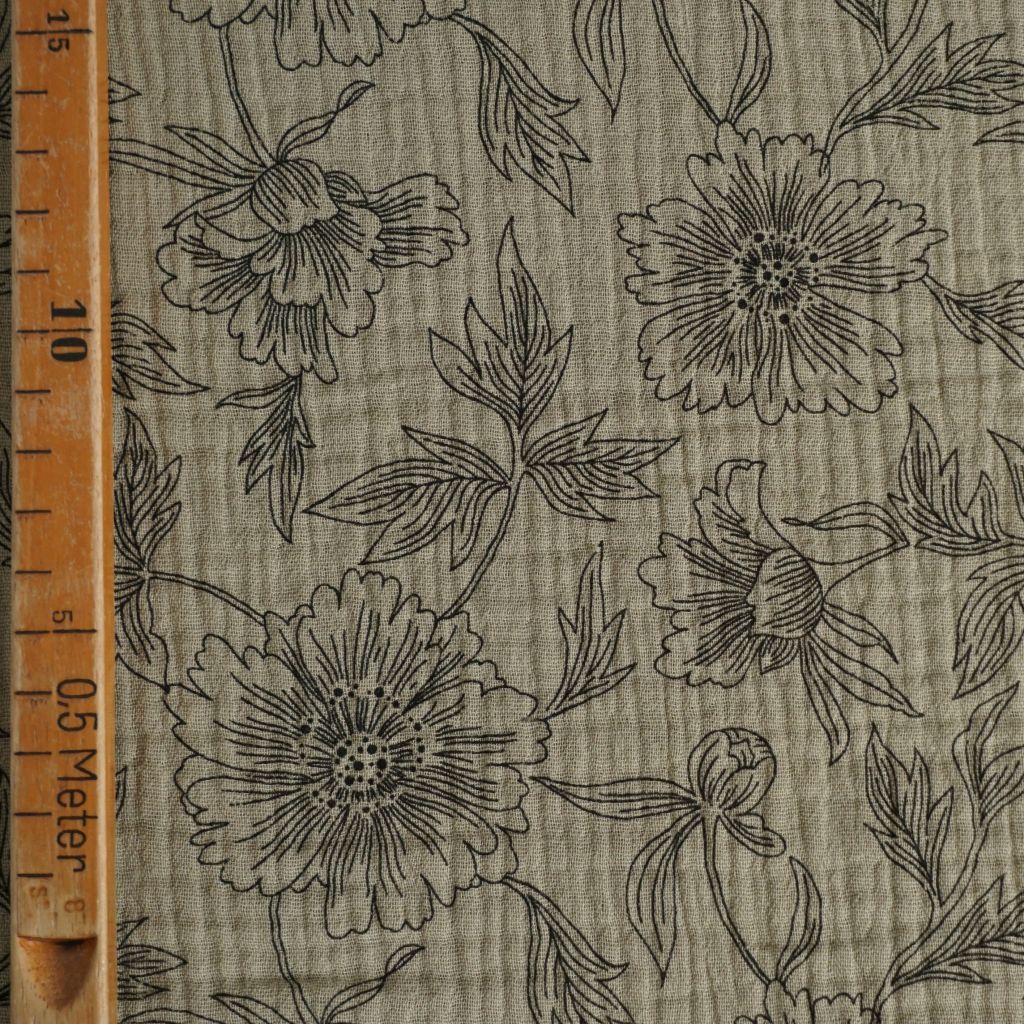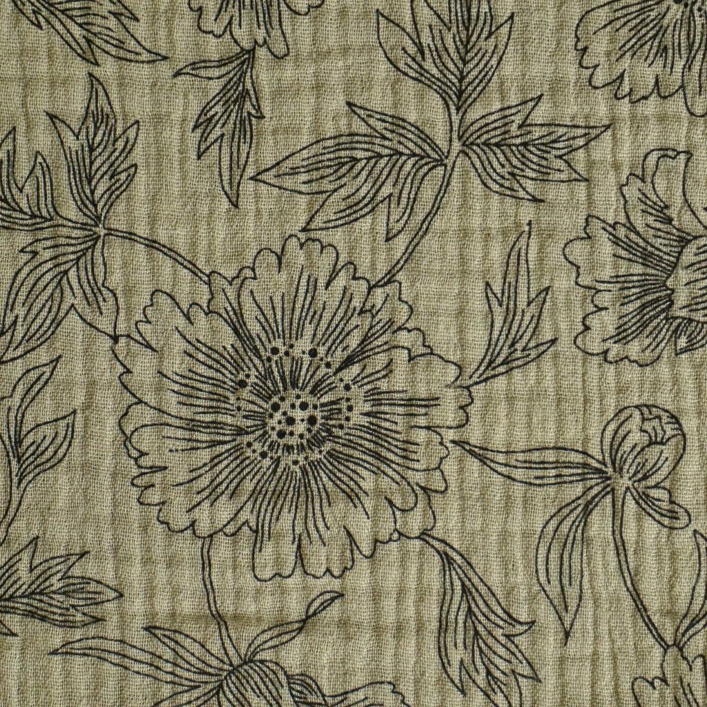 Musselin Double Gauze Blütenzeichnung schwarz auf helloliv