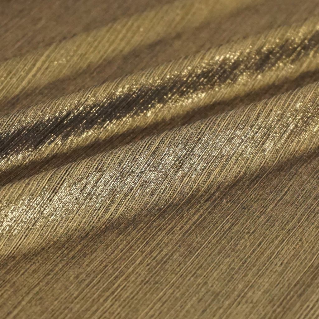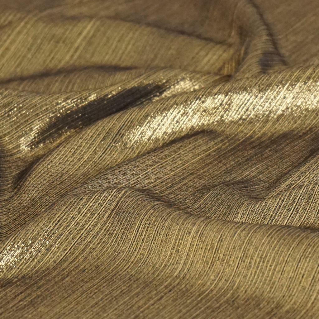 Der feine in kleine Fältchen gelegte Stoff ist goldfarben folienbeschichtet. Die Folie ist fest auf den Stoff aufgebracht, sodass du keine Glitzerspuren hinterlässt. Das Plissee wirkt effektvoll dreidimensional. Rückseitig ist der Stoff schwarz. Näh die ein aufregendes Tanzoutfit, ein blickfangendes Kleid oder ein güldenes Kostüm.