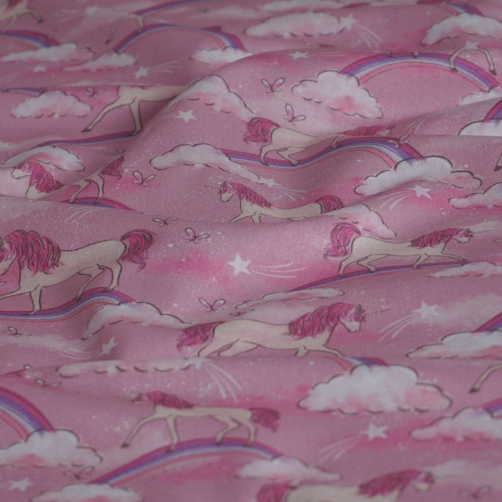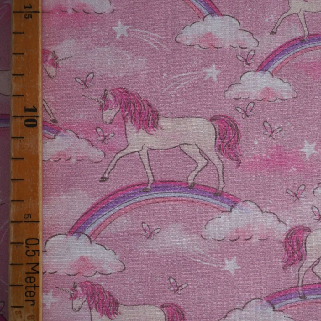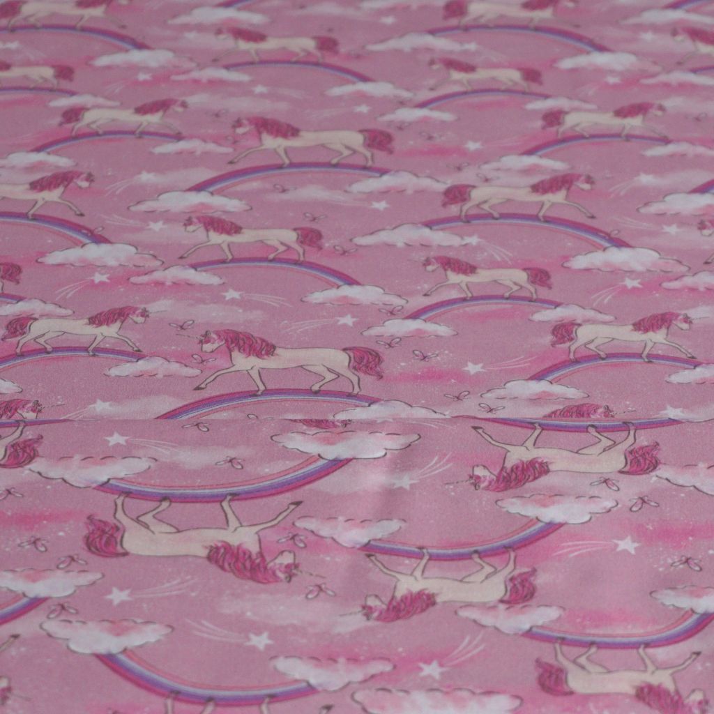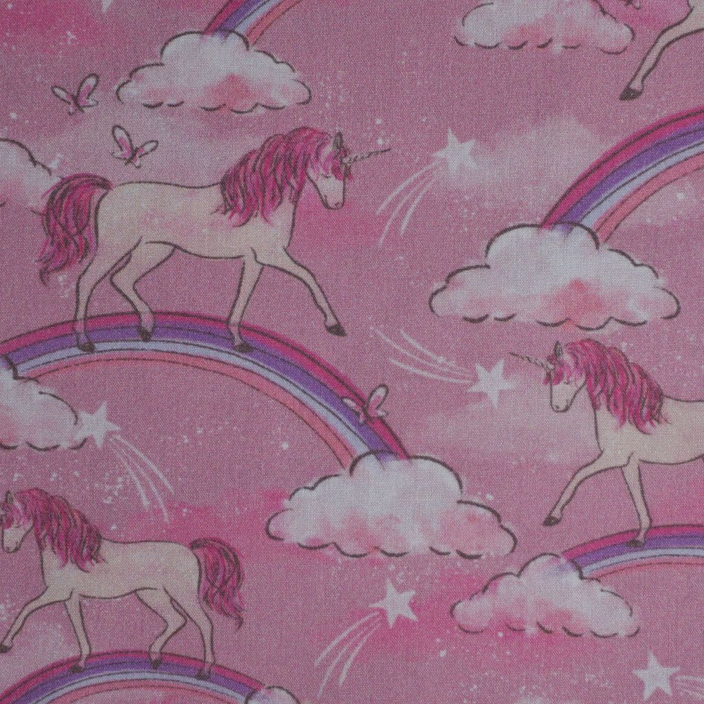 REST Baumwollstoff Motivdruck Einhorn auf Regenbogen rosa