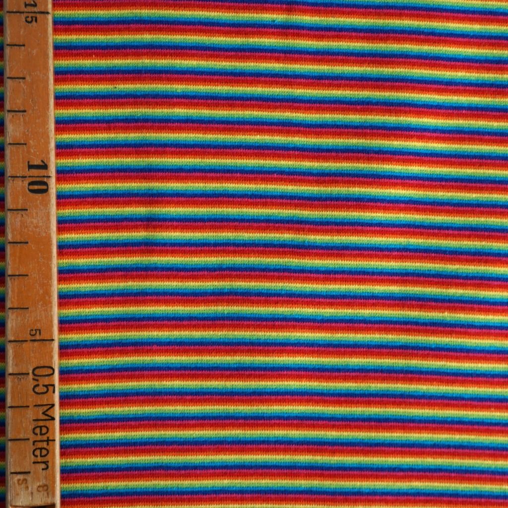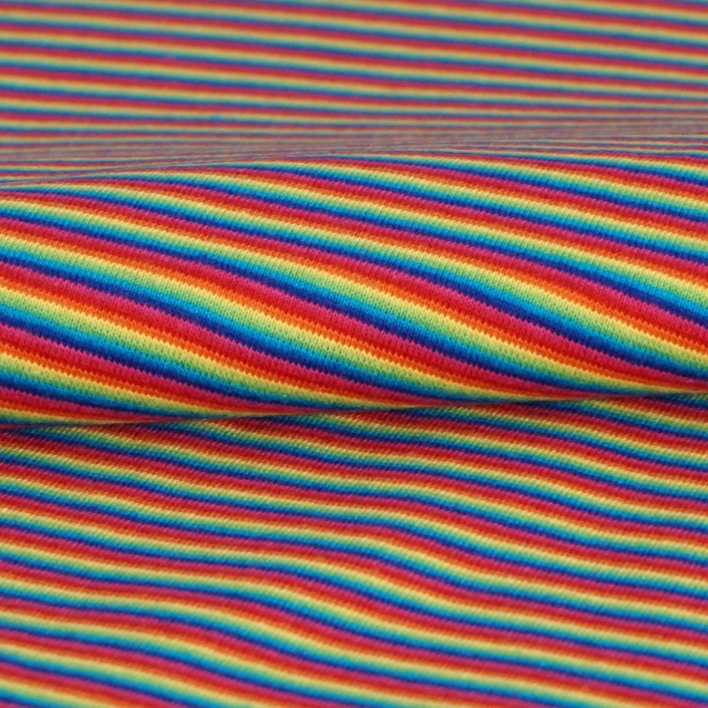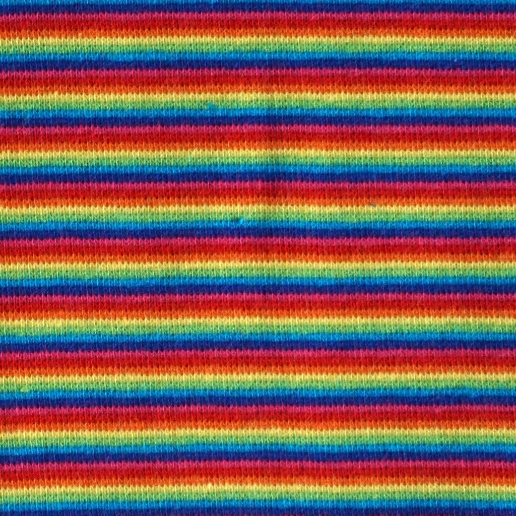 Das in vielen bunten Streifen geringelte Bündchen passt so gut wie immer. Die Bündchenware ist im Schlauch gestrickt und hat eine gleichmäßige glatte Oberfläche.