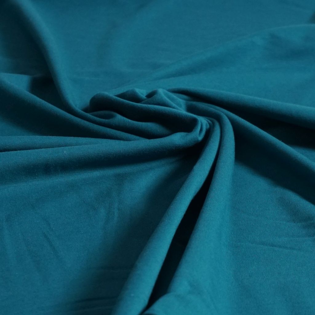 Unser einfarbiger Singlejersey ist aus Bio-Baumwolle gestrickt. Der Elasthan-Anteil sorgt dafür, dass dein Kleidungsstück sich schön anschmiegt, nicht so knittert und formstabil bleibt. Dabei hat der Stoff genug Griff um hervorragend auch mit der Haushaltsnähmaschine vernäht zu werden. Dieser Jersey ist bei uns ein Basicstoff, den wir immer im Sortiment haben.