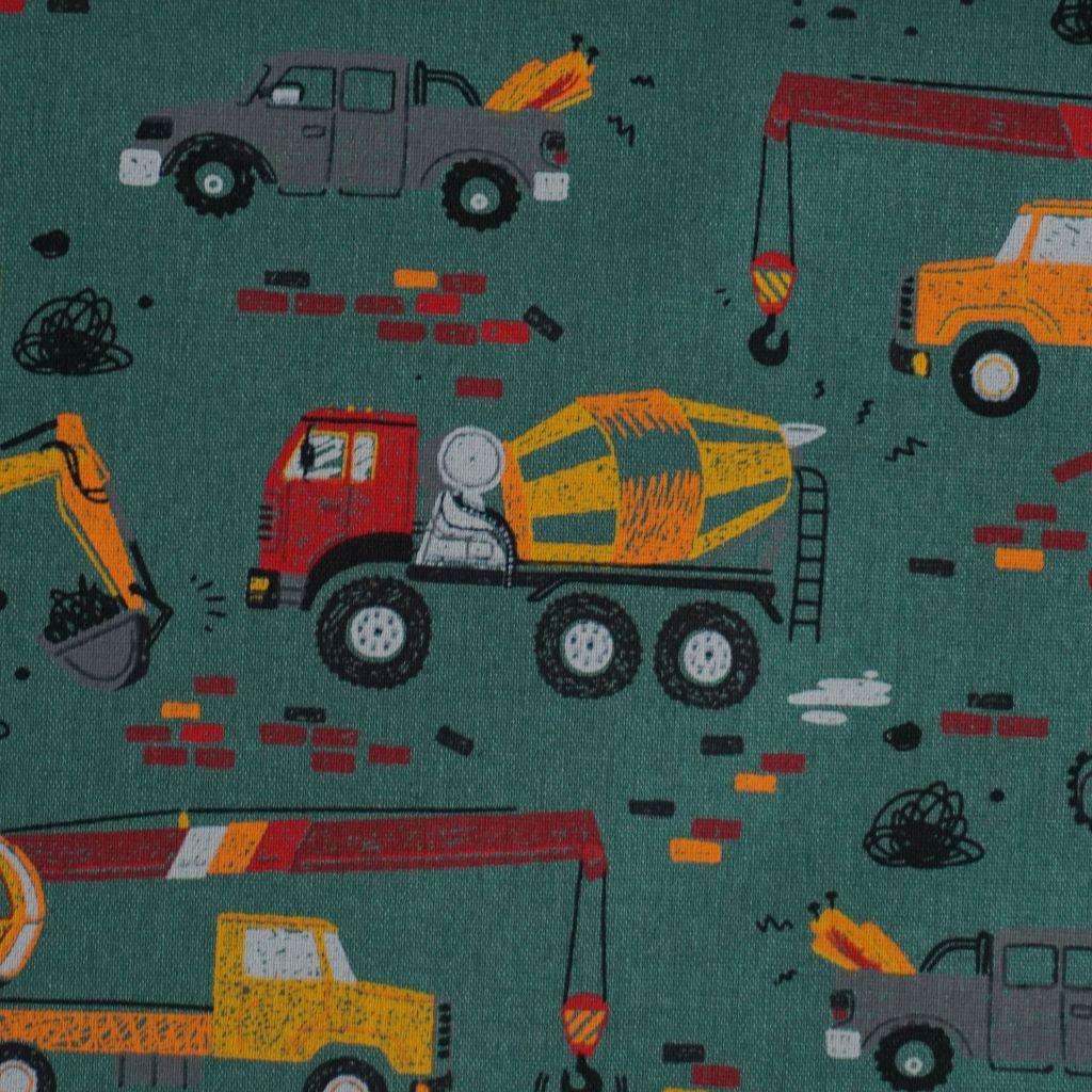 Baumwollstoff Motivdruck Baufahrzeuge auf grün