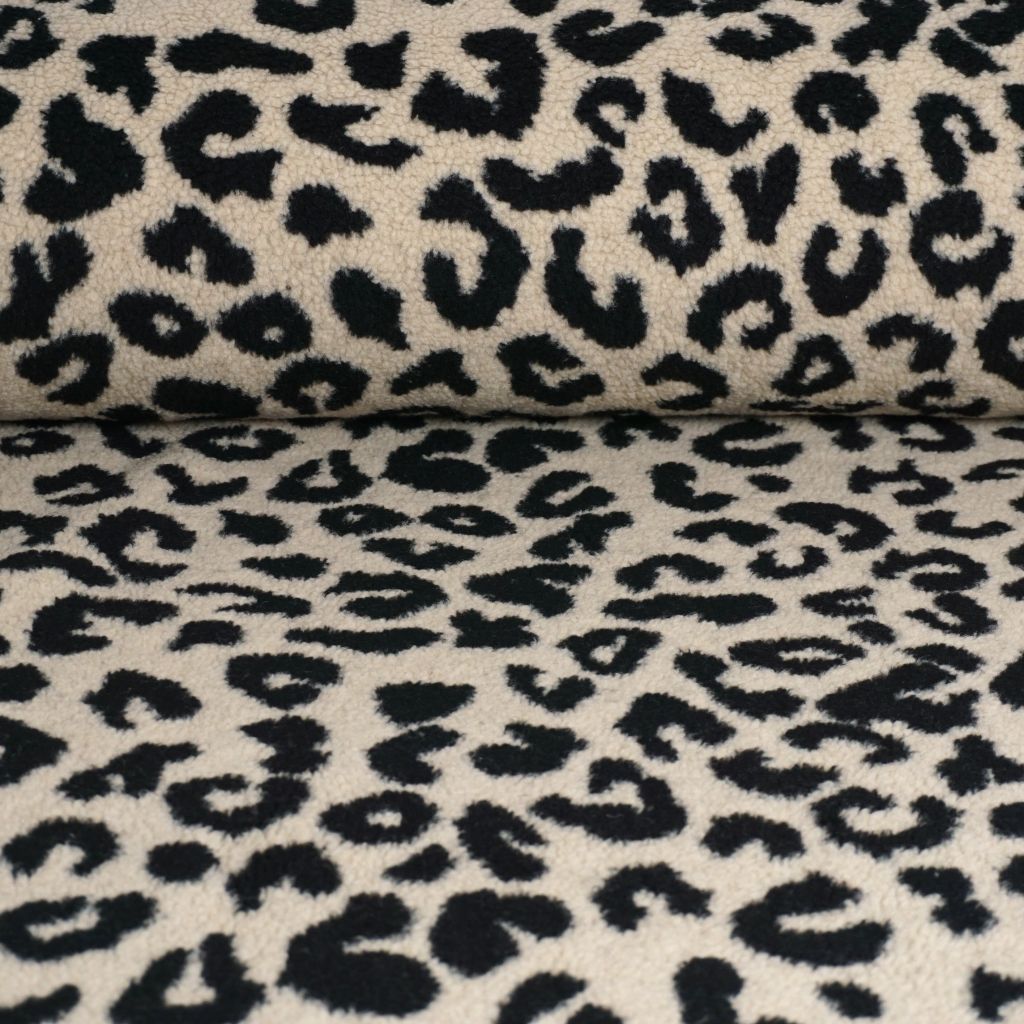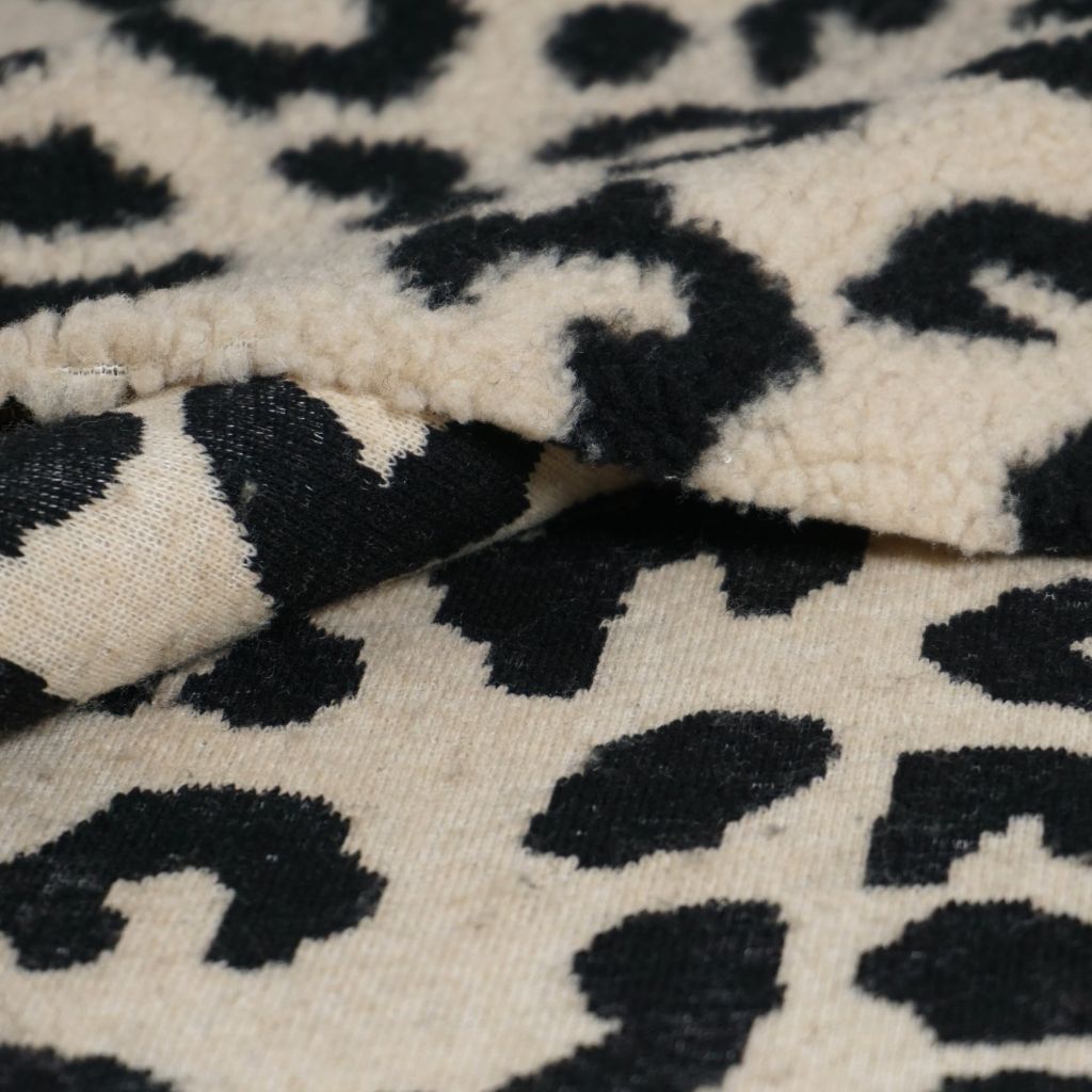 Eigenschaft: dick, viel Volumen, plüschige Oberseite, gestrickte glatte Unterseite, trendiges Leopardenmuster