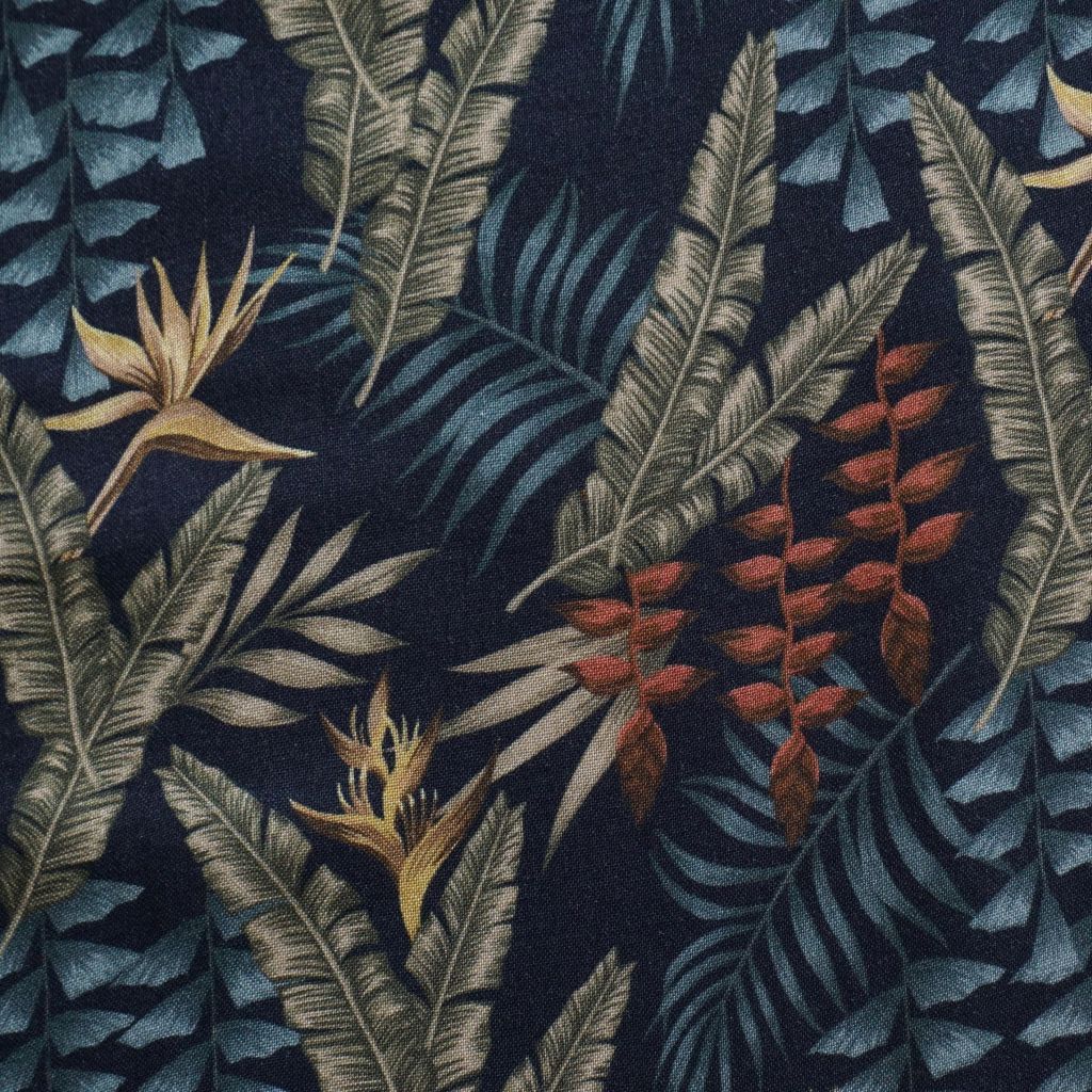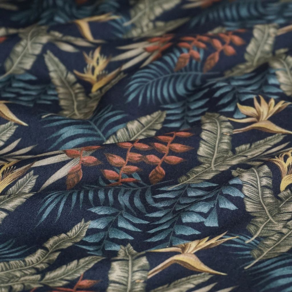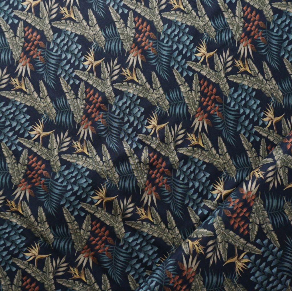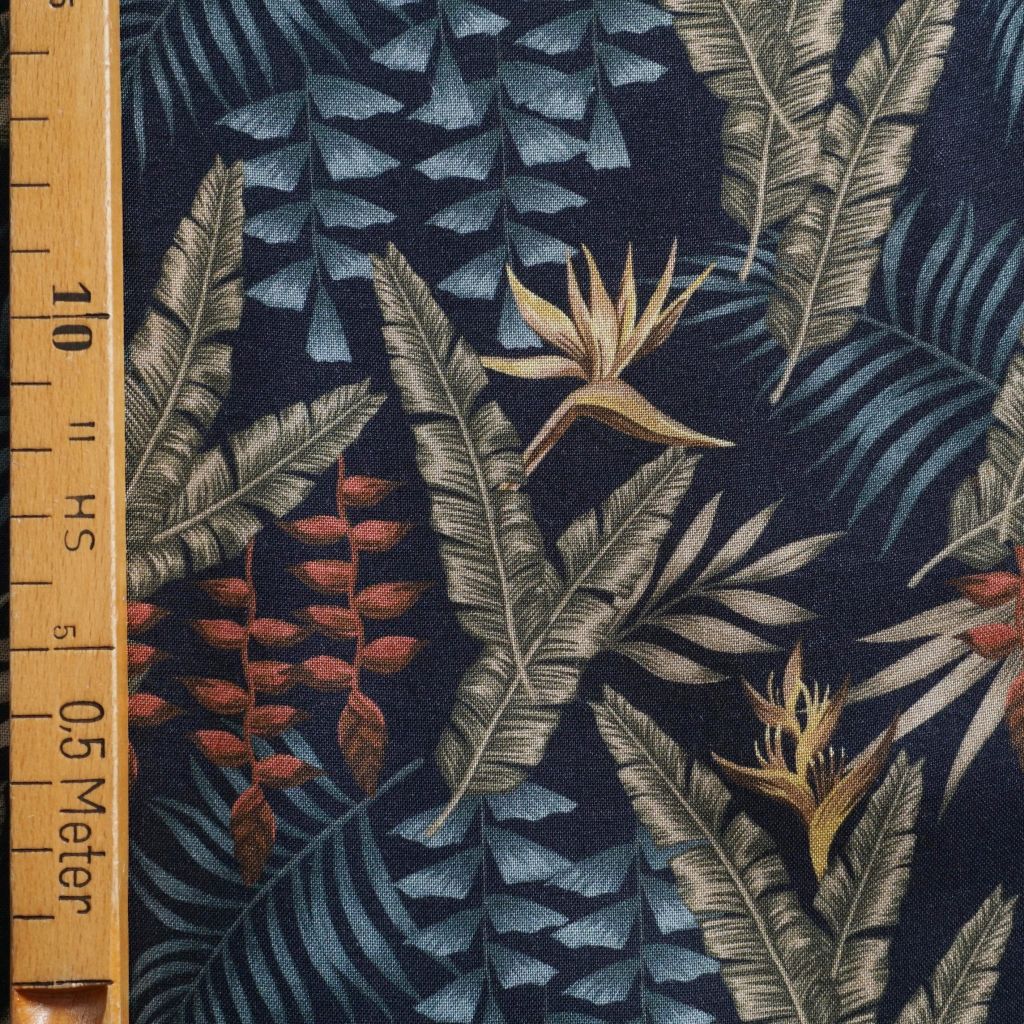 Viskose Druck Blätter Farne rost grün petrol auf dunkelblau