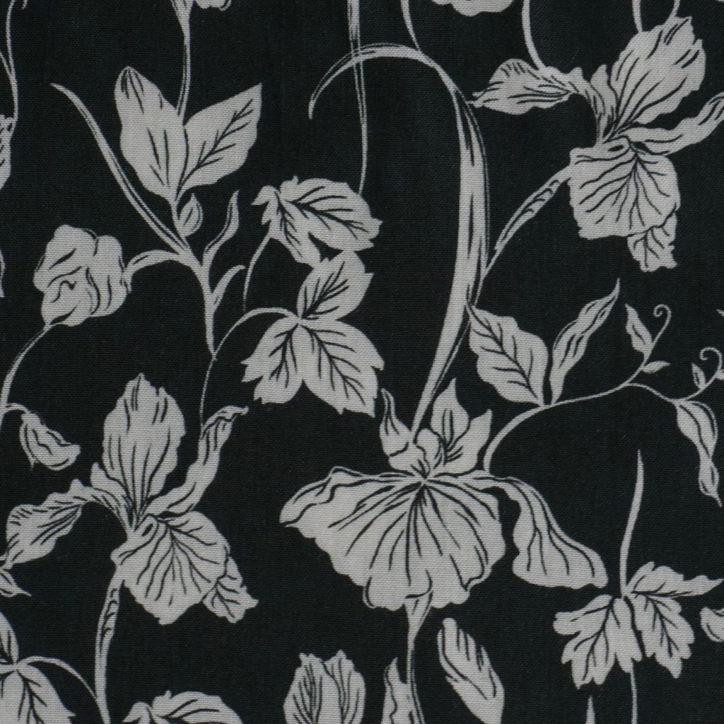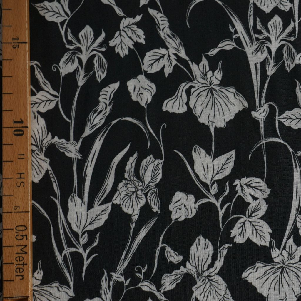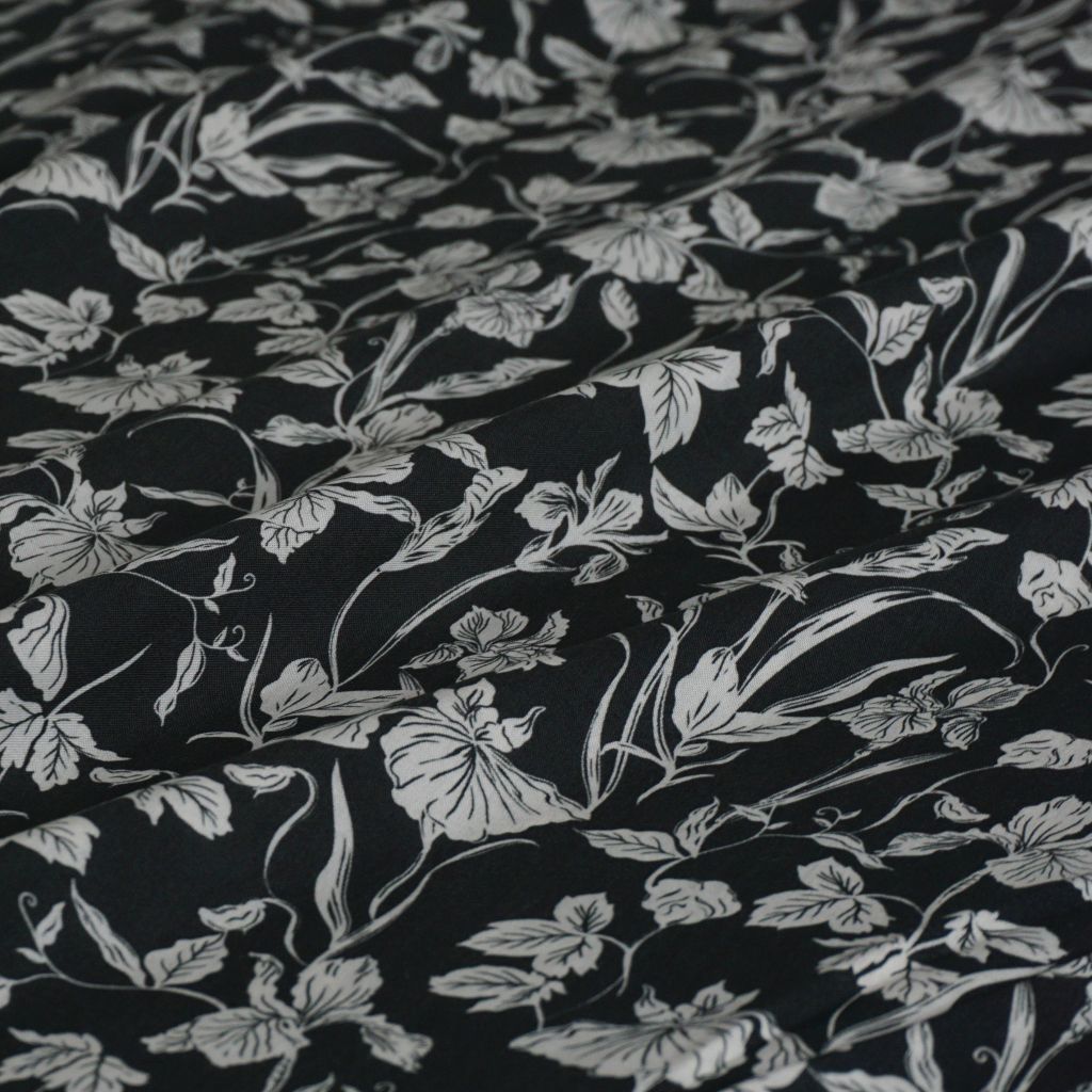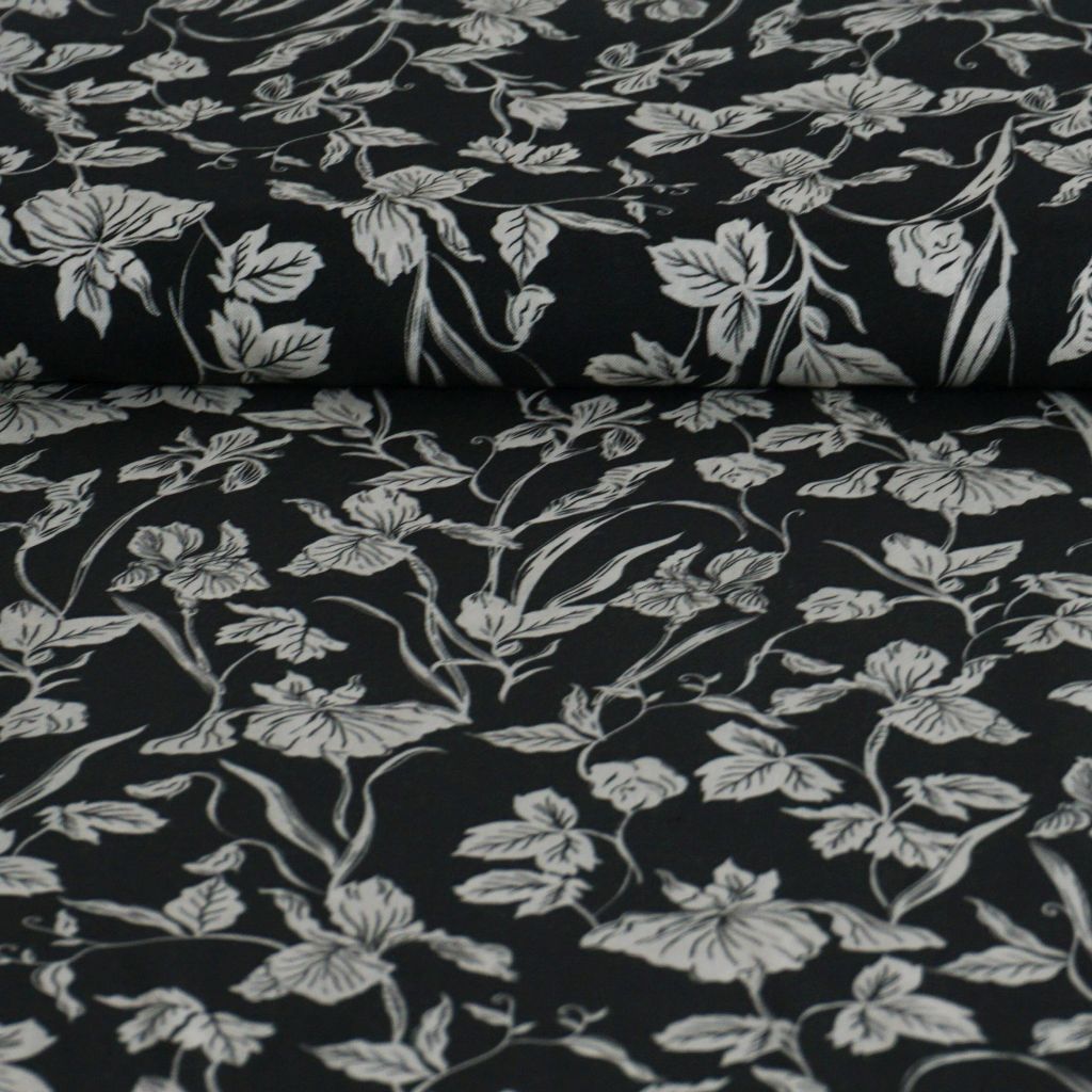Viskose Druck Lyocell kittweiße Blüten Blätter auf schwarz