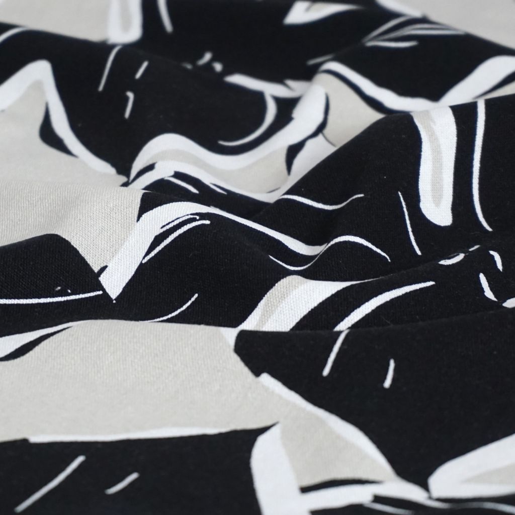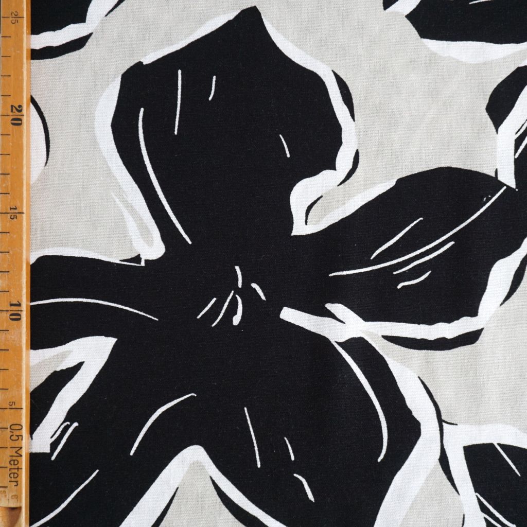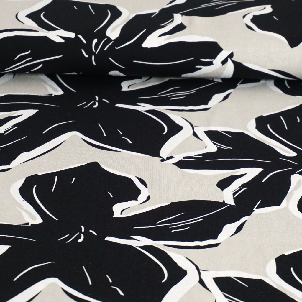 Viskose-Leinenstoff große Blüten schwarz hellbeige