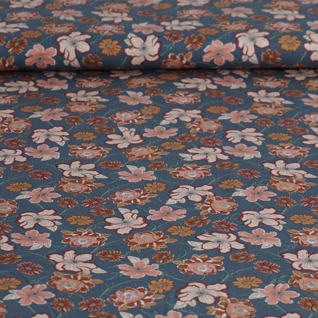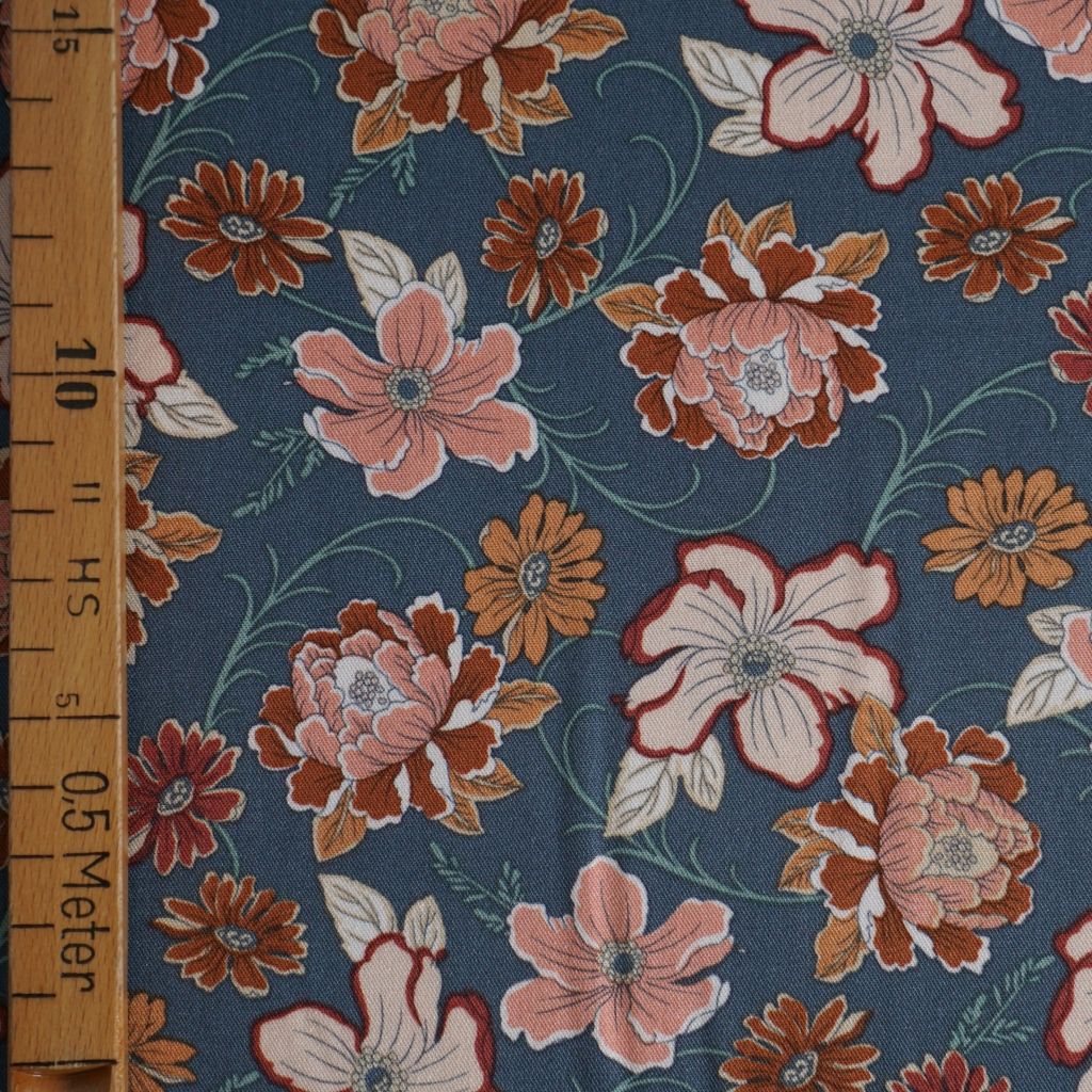 Viskose Stretch Druck Blüten beige rost auf rauchblau